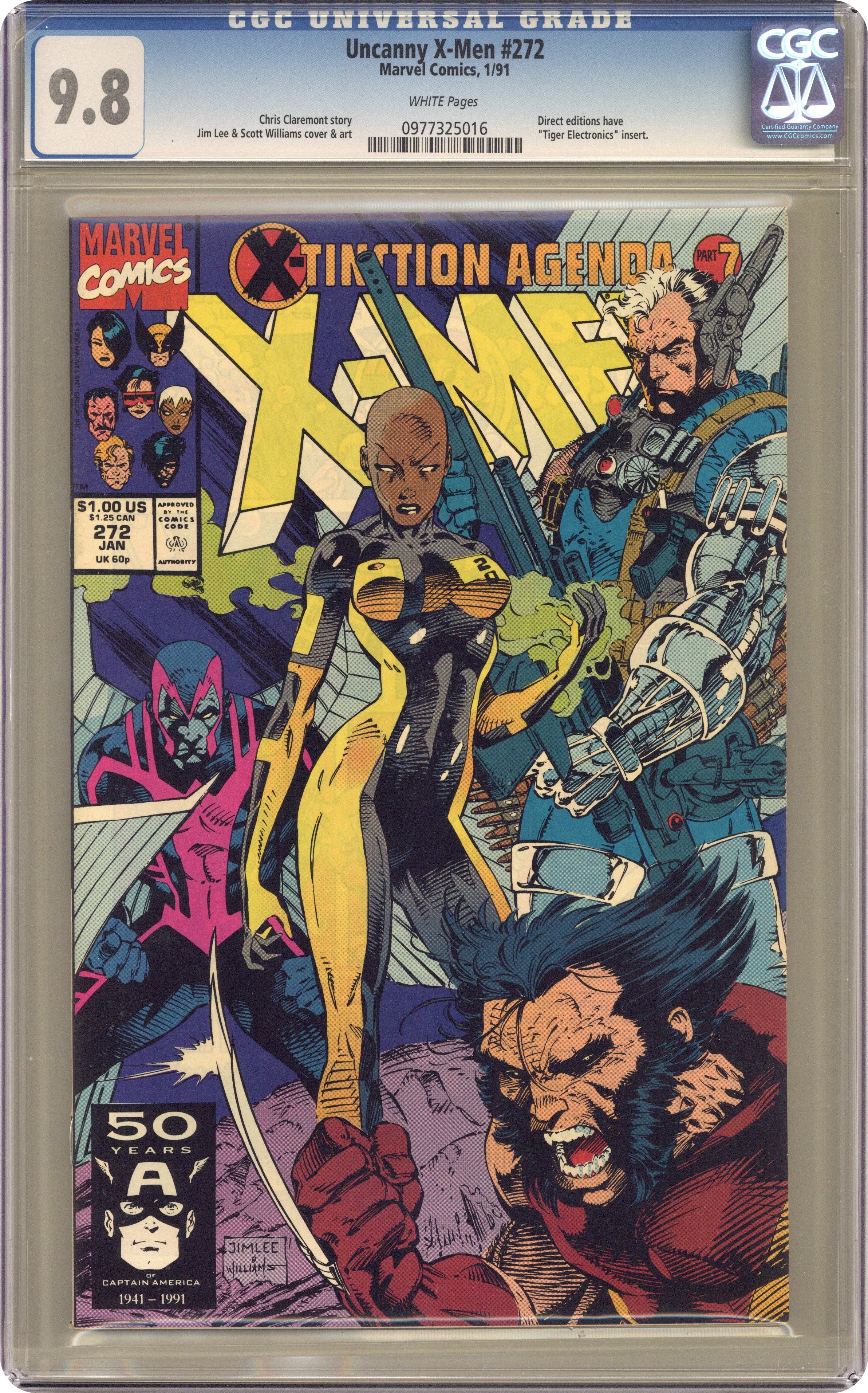 X-Tinction Agenda: Part 7 of 9. "Capital Crimes!" Guest-starring X-Factor and the New Mutants. Cameos by Reed Richards, She-Hulk, and the Punisher. Story by Chris Claremont. Art and cover by Jim Lee and Scott Williams. Story continued from X-Factor #61. Things get worse. The X-Men and their allies are on the verge of being exterminated. Will the sinister Cameron Hodge finally have his revenge, or is there still hope? Story continues in New Mutants #97. 40 pgs. Cover price $1.00. Grade: CGC 9.8 explanation of grade Condition: Used (collectible)