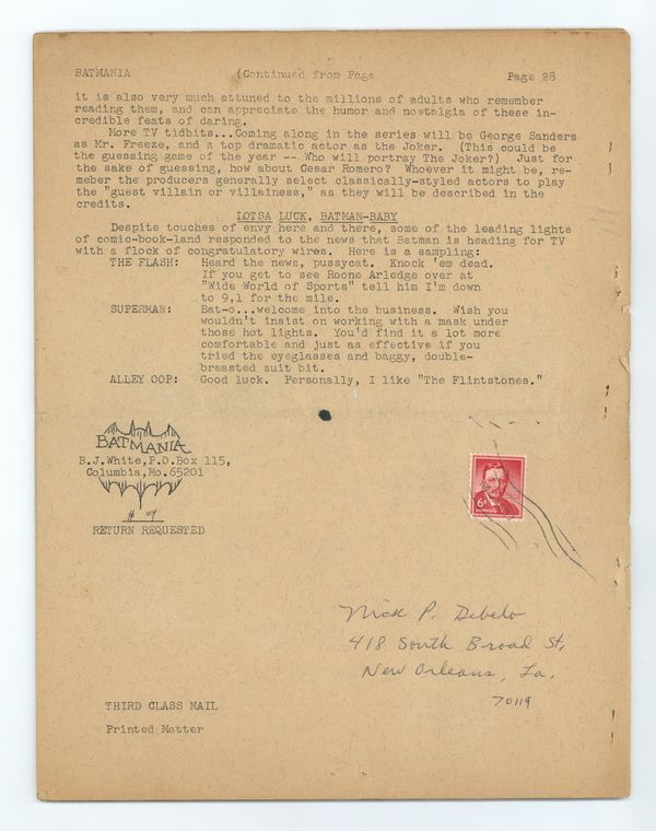 Ended Dec 4 2023 Winning Bid $34 24-page mimeographed magazine published by Biljo White. Black-and-white with spot color. Features include "Evolution of the Batplane" pictorial, Reviews of Robin's solo adventures in Star Spangled Comics, plus some news. Grade: GD 2.0 explanation of grade Condition: Used (collectible)