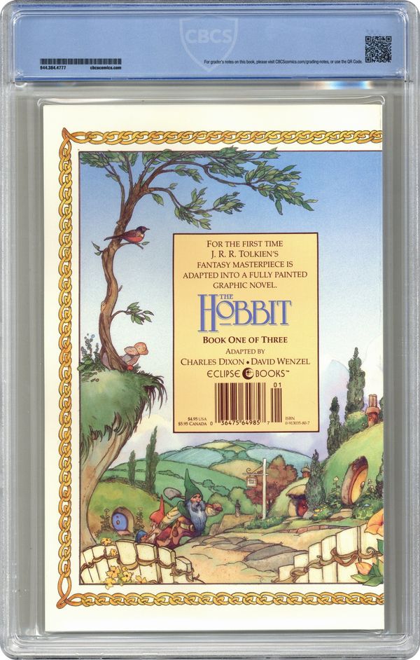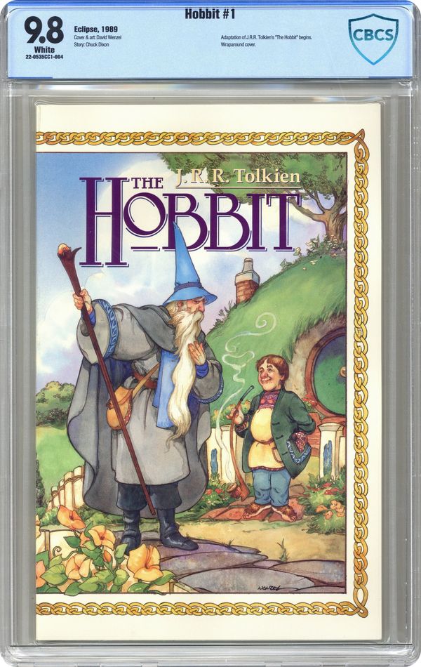 First printing. From the book by J.R.R. Tolkein. Adapted by Charles Dixon. Art and cover by David Wenzel. Part 1 of 3. All Bilbo Baggins wants is a quiet life on the Hill. But when the wizard Gandalf shows up with tales of treasure and the dragon Smaug, Bilbo decides there might be more to the world than his little corner. 48 pages. Full color. Cover price $4.95. Grade: CBCS 9.8 explanation of grade Condition: Used (collectible)