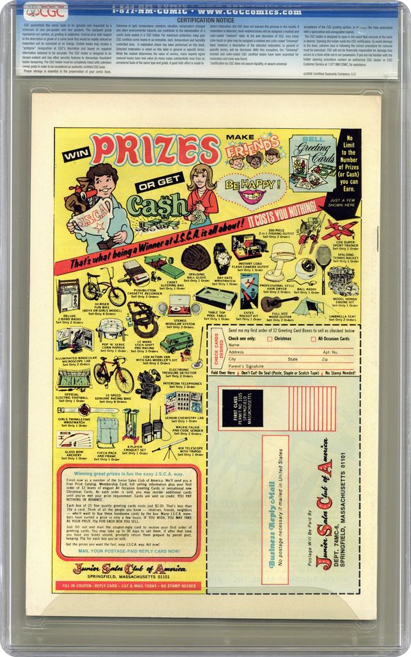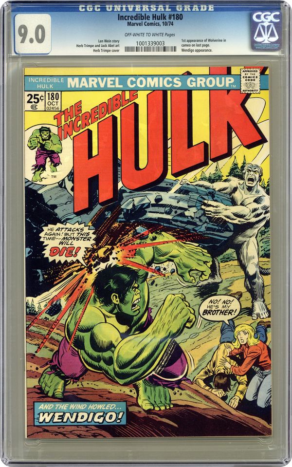 First appearance of Wolverine (cameo last panel). Cover art by Herb Trimpe. And the Wind Howls...Wendigo!, script by Len Wein, pencils by Herb Trimpe, inks by Jack Abel; Hulk is in Canada looking for some peace and quiet when he is mysteriously drawn to a cave inhabited by the sister of the man who became the Wendigo; Marie and Georges plan on transferring the power of the Wendigo to the Hulk, thus restorin Paul Cartier to his normal life; Marie's magic isn't strong enough, however, and just as Wendigo shows up, the Hulk wakes up from his magical slumber and the two battle; The Canadian government gets involved and sends in their own agent to take care of a recent Hulk sighting, the mutant known as Wolverine. Marvel Value Stamp Series A (Cyclops). 36 pgs. $0.25. Cover price $0.25. Grade: CGC 9.0 explanation of grade Condition: Used (collectible)
