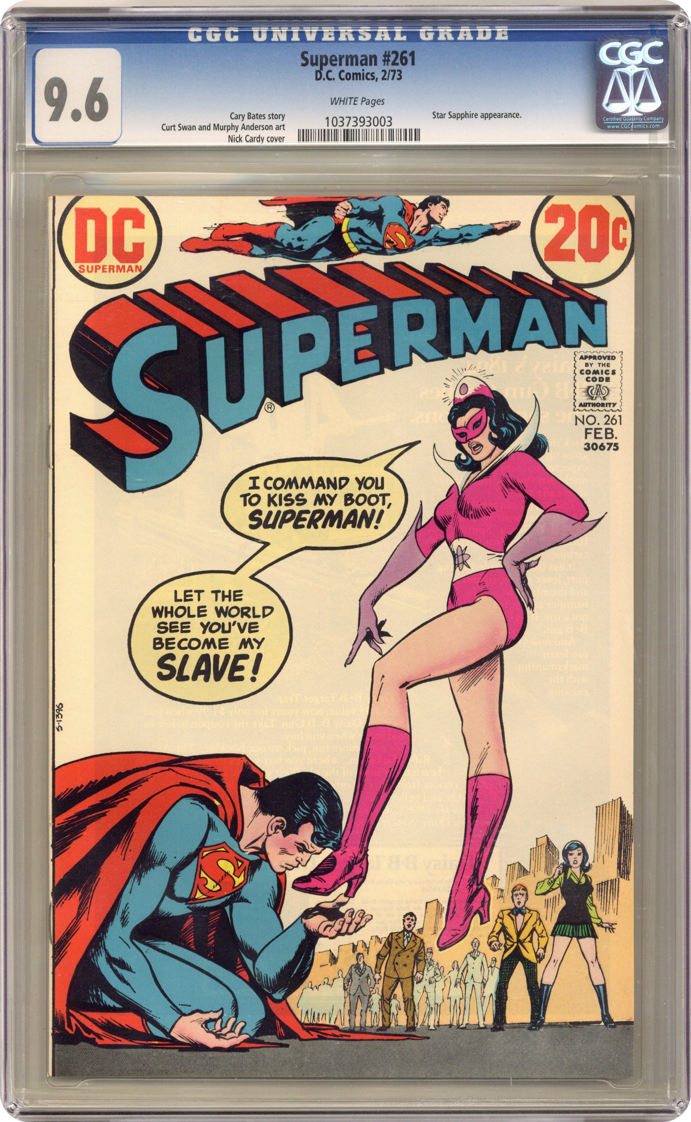 Ended Jan 22 2024 Winning Bid $443 Cover art by Nick Cardy. Slave of Star Sapphire!, script by Cary Bates, pencils by Curt Swan, inks by Murphy Anderson; Carol Ferris thinks Superman is attacking Green Lantern, so she becomes Star Sapphire to fight him. 36 Pages, Full Color. Cover price $0.20. Grade: CGC 9.6 explanation of grade Condition: Used (collectible)