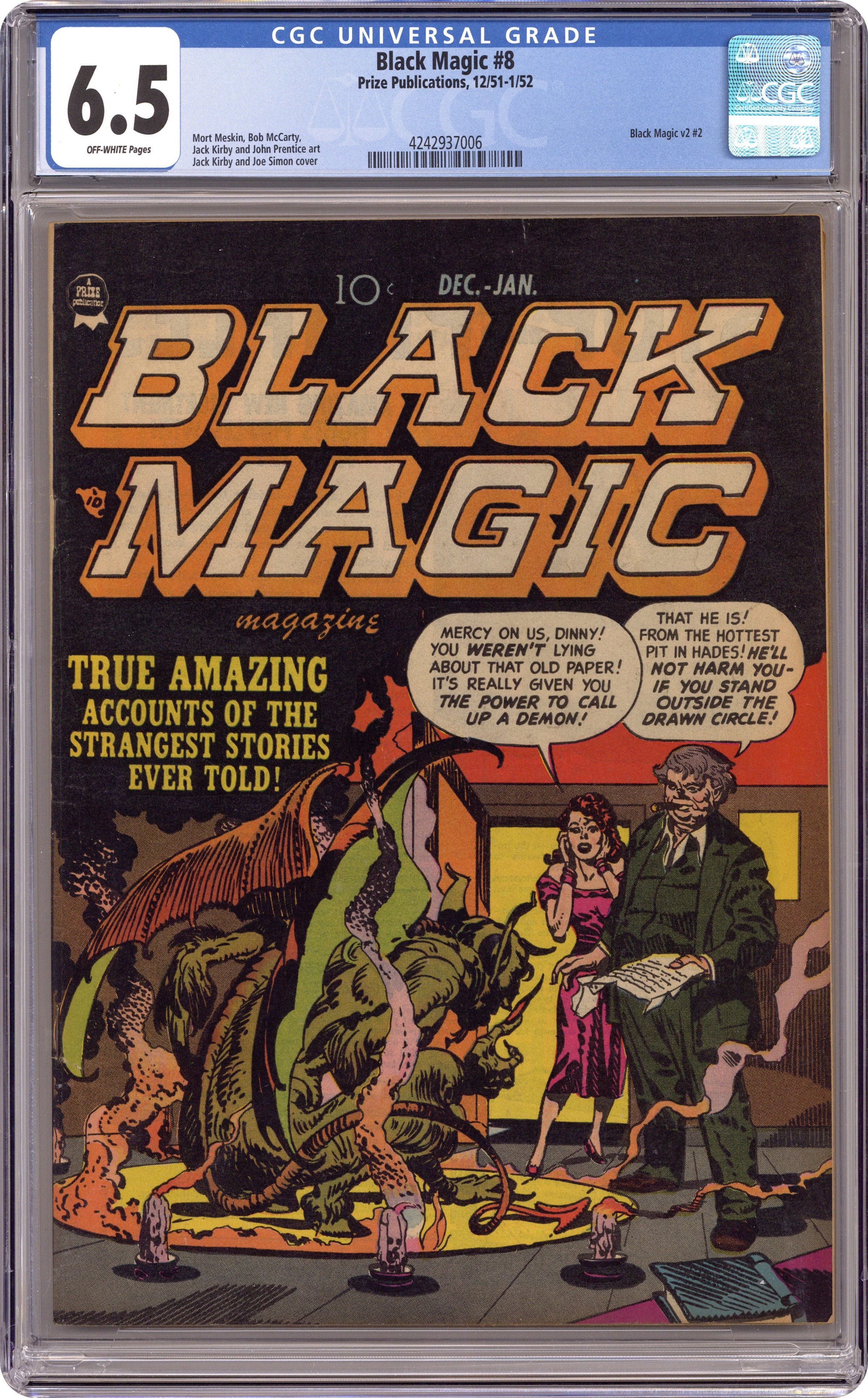 Ended Jan 20 2024 Winning Bid $214 Cover by Jack Kirby. Art by John Prentice, Mort Meskin, and Jack Kirby. Captain America creators Joe Simon and Jack Kirby present their own contribution to the horror comics trend of the 1950s, featuring tales of ghosts and the paranormal. Sometimes listed as Black Magic #8. No issue number listed on cover; listed as Vol. 2, issue #2 in indicia. Donovan seeks the parchment that allowed him to summon a demon five years ago. Identical twins have a psychic bond that allows them to share every sensation. A crystal ball acquired at an auction reveals a dark future. Donovan's Demon; Invisible Link!; The House That Tried to Kill Me!; The Nightmare; The Curse of the Crystal Ball! 44 pages, Full Color. Cover price $0.10. Grade: CGC 6.5 explanation of grade Condition: Used (collectible)