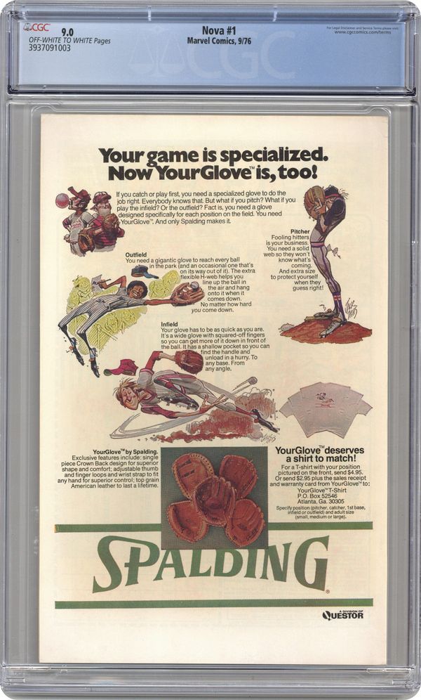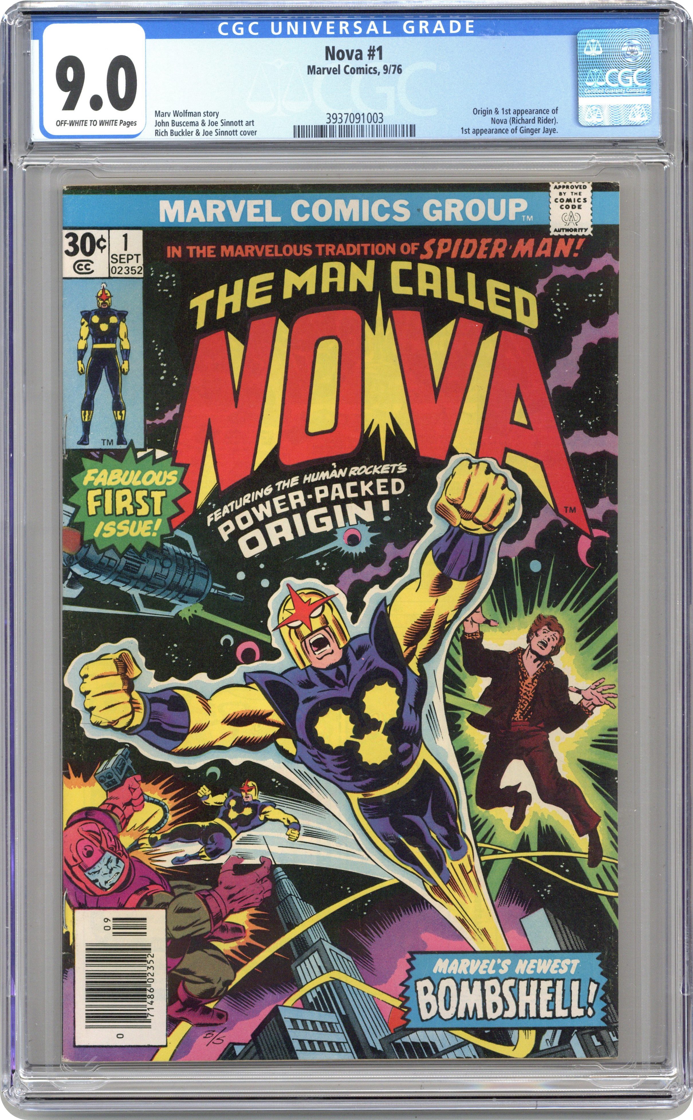 Written by Marv Wolfman. Pencils by John Buscema. Inks Joe Sinnott. When a dying alien passes on his super-powers to Earth teenager Richard Rider, Rider becomes the man called Nova, the human rocket! In the marvelous tradition of Spider-man, Nova must now stop the murderous alien known as Zorr, or Earth is doomed! Note: First appearance of Nova. 36 pages, full color. Cover price $0.30. Grade: CGC 9.0 explanation of grade Condition: Used (collectible)