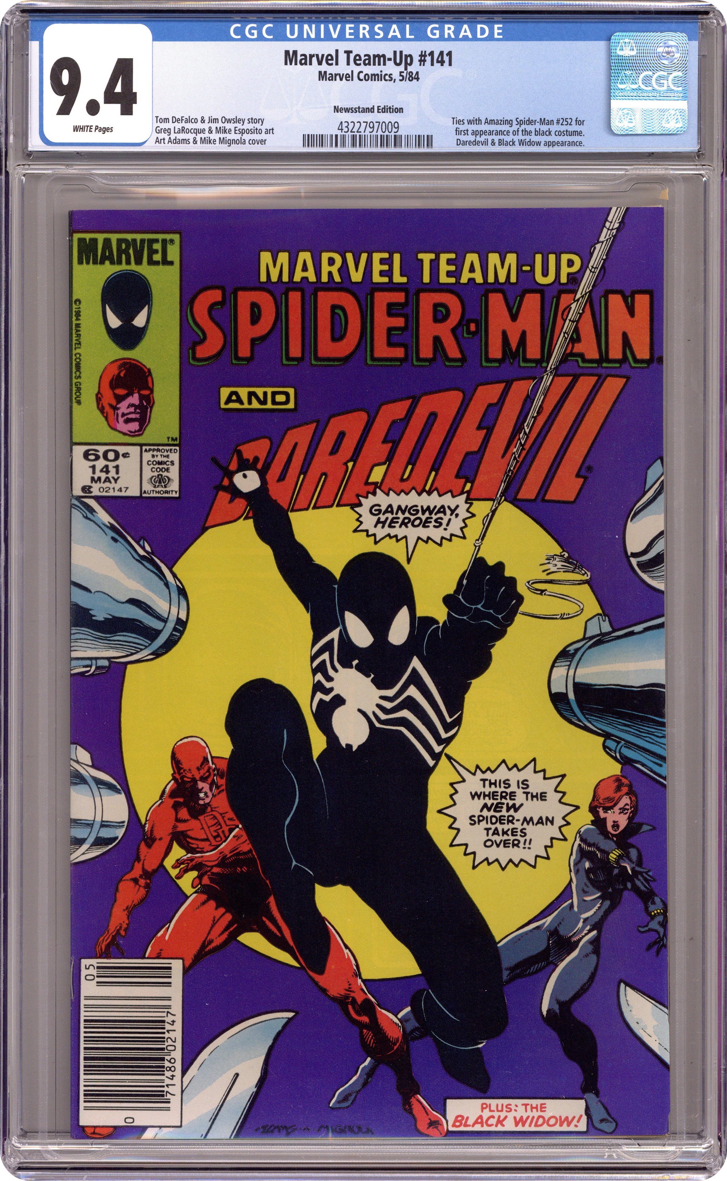Newsstand Edition. "Blind Justice!" Part 2 of 2. Guest-starring Spider-Man, the Black Widow, and Daredevil. Plot by Tom DeFalco. Script by Jim Owsley. Art by Greg LaRocque (breakdowns) and Mike Esposito (finishes). Cover by Art Adams and Mike Mignola. Spider-Man is missing! What has happened to the spectacular one? Regardless, Daredevil and the Black Widow must keep working on the pawnbroker murder case in order to prevent an innocent man from going up the river! The Man Without Fear and Natasha just about have the case solved, when the web-slinger suddenly reappears...in a brand new costume! They'll be glad to have Spidey's help to finish this caper...or will they? Daredevil's deal with the Kingpin may not go over too well with your friendly neighborhood Spider-Man! Cameo appearances by the Kingpin, the Arranger, and Dr. Curt Connors. (Notes: Spider-Man's new costume debuted this month in Amazing Spider-Man 252, Spectacular Spider-Man 90, and this issue. The letters page includes a letter from Marvel creator Stan Lee.) 36 pages. Cover price $0.60. Grade: CGC 9.4 explanation of grade Condition: Used (collectible)