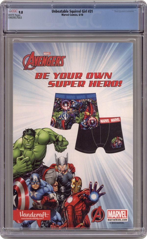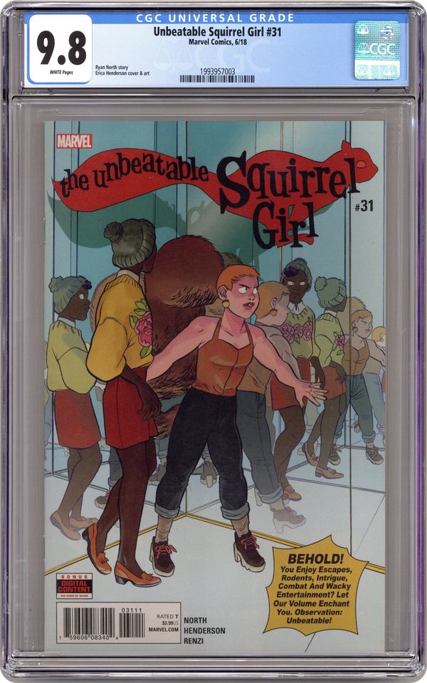 Written by Ryan North. Art and Cover by Erica Henderson. Have you been doodling 'I wish they'd do an issue where Squirrel Girl got a new super-power, and Nancy Whitehead ALSO got a super-power' in your diary? WE HAVE SOME GOOD, INCREDIBLY SPECIFIC-TO-YOU NEWS: That is happening! In this special stand-alone issue, when Doreen and Nancy are blasted into hypertime, they're moving so fast as to be invisible to everyone. So of course they decide to fight crime at super speed! But are there downsides to moving really fast? (Yes, there are.) Can anyone in regular time get them back? (Nope.) Will they be trapped there... FOREVER?? We're not answering that last question because you'll have to buy the issue to find out! 28 pages, full color. Rated T Cover price $3.99. Grade: CGC 9.8 explanation of grade Condition: Used (collectible)