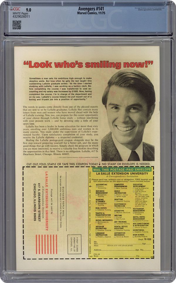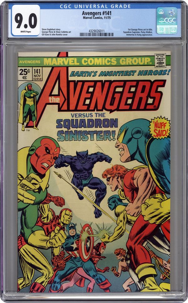 "The Phantom Empire!" Part 1 of 7. Script by Steve Englehart. Pencils by George Perez (first work on the Avengers). Inks by Vince Colletta. Cover by Gil Kane and John Romita. A landmark issue of the Avengers with one of the best covers of the bronze age! Also the first issue of the last great saga of the Steve Englehart era that sends one half of Earth's Mightiest Heroes to another world...and the other half to another time! And featuring George Perez's first artwork on the Avengers title. Now to the story...Captain America returns to Avengers Mansion seeking help in his ongoing struggle against the Brand Corporation and Roxxon Oil. However, the Avengers already have a crisis on their hands with the confirmation of Hawkeye's disappearance...and the high probability of Kang the Conqueror's involvement! So Thor and Moondragon summon Immortus to assist them in traveling back in time; while the remaining Avengers and Patsy Walker invade the Brand Corporation's Long Island facility expecting to fight a small private army...not the Squadron Supreme! Cameo appearances by the Wasp and Yellowjacket. Flashback cameos by the Falcon, Nomad, and the Red Skull to recap Cap's recent encounter with the Serpent Crown. (Notes: George Perez paid homage to Gil Kane's classic cover with his cover to Avengers (3rd series) 6. The cover should read the Avengers vs. the Squadron Supreme Instead of the Squadron Sinister. The Squadron Supreme previously appeared in Avengers 86.) 36 pgs. Cover price $0.25. Grade: CGC 9.0 explanation of grade Condition: Used (collectible)