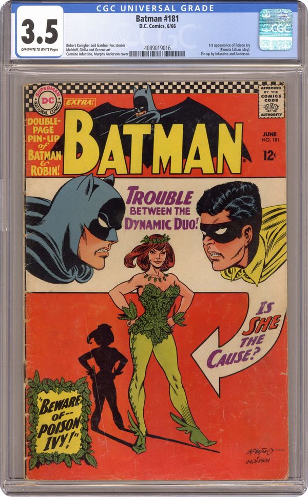 Ended Jan 22 2024 Winning Bid $505 The 1st appearance of Poison Ivy. Cover pencils by Carmine Infantino, inks by Murphy Anderson. "Beware of--Poison Ivy!", script by Robert Kanigher, pencils by Sheldon Moldoff (as Bob Kane), inks by Joe Giella; While Bruce and Dick are attending an art show, a woman shows up, claiming to be the greatest criminal of those currently residing in Gotham. Centerspread is a great two-page color poster of Batman and Robin, pencils by Carmine Infantino, inks by Murphy Anderson. "The Perfect Crime--Slightly Imperfect!", script by Gardner Fox, inks by Sid Greene; At the latest meeting of the Anaylists, Kaye announces that she didn't write her latest book, and seems to be threatened by a voice from her brooch; Batman has a feeling that the Kaye at the meeting is an imposter, so he looks into the matter. Letter from future comics writer Mike Friedrich. Rocky and Bullwinkle star in a one-page Cheerios ad. 36 Pages, Full Color. Cover price $0.12. Grade: CGC 3.5 explanation of grade Condition: Used (collectible)