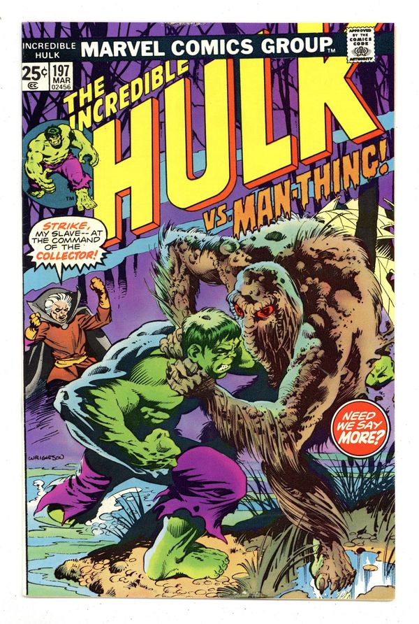 Ended Dec 12 2023 Winning Bid $22 Cover by Bernie Wrightson. "...And Man-Thing Makes Three!," script by Len Wein, pencils by Sal Buscema (breakdowns) and Joe Staton (finished art), inks by Joe Staton; Following his battle with the Abomination, the Hulk finds himself in the Florida Everglades, and he is not happy; As he tromps through the swamp he is completely unaware that his presence has attracted the attention of the Man-Thing, who watches the brute silently; The Hulk is attacked by various alligators and snakes, prompting the Hulk to angrily ball them up and toss them away; He then stumbles across the ruins of Omegaville; The Hulk battles the Man-Thing. Guest-starring Doc Samson, the Glob, the Collector, and Cap'n Cutlass (Horatio Cutlass). Marvel Value Stamp series B #51. 36 pgs., full color. $0.25. Cover price $0.25. Grade: FN 6.0 explanation of grade Condition: Used (collectible)