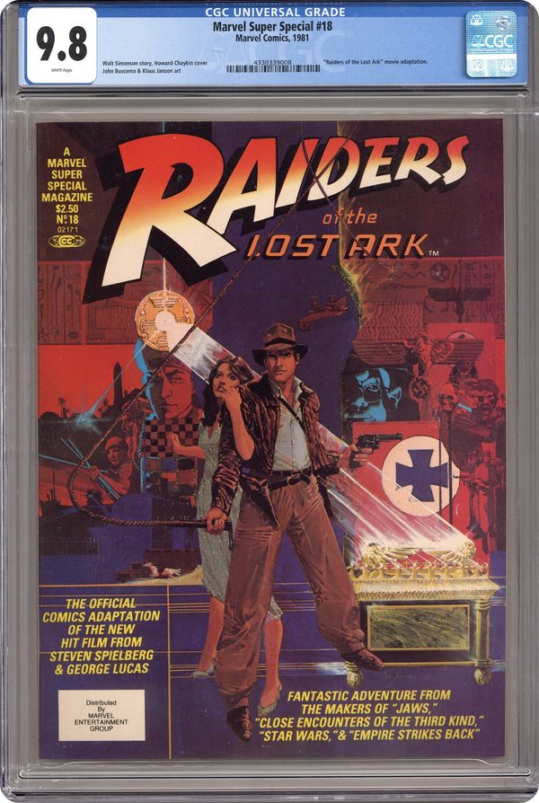 Ended Jan 19 2024 Winning Bid $570 Direct Edition. Raiders of the Lost Ark. The official comic book adaptation of the George Lucas/Steven Spielberg classic, introducing Indiana Jones. Written by Walt Simonson, with art by John Buscema and Klaus Janson. Story later reprinted in Raiders of the Lost Ark #1-3 and Marvel Movie Spotlight #1. Full color; 68 pages. Painted cover by Howard Chaykin. Cover price $2.50. Grade: CGC 9.8 explanation of grade Condition: Used (collectible)
