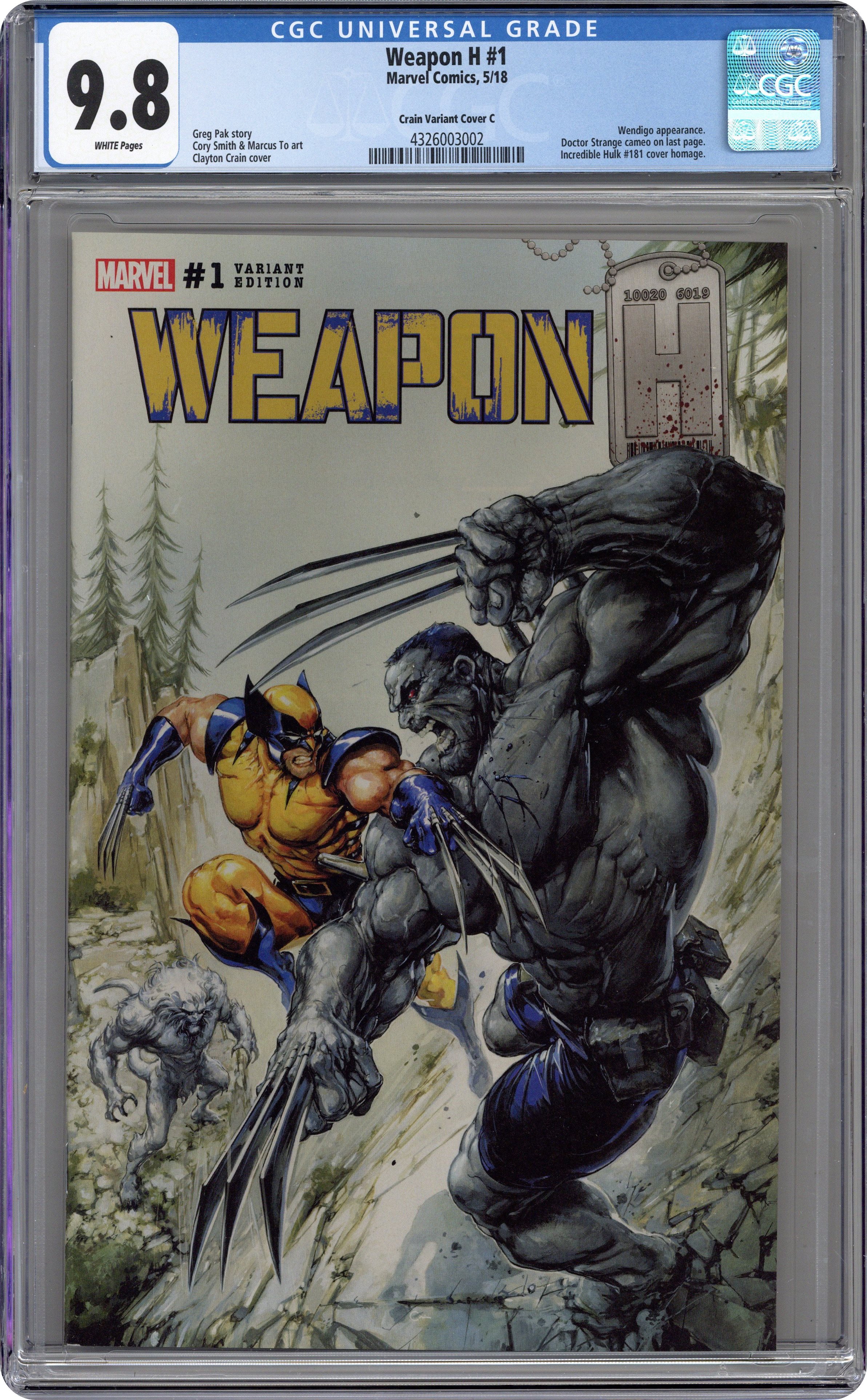 Ended Feb 6 2024 Winning Bid $43 Frankie's Comics exclusive variant by Clayton Crain. Written by Greg Pak. Art by Cory Smith. AWOL Part 1 The Weapon X Program has done it again! At the cost of their own destruction, they've completed their biggest and possibly most dangerous experiment yet… With the strength of the Hulk and the rage and claws of Wolverine comes WEAPON H! It's been some time since Weapon H escaped and destroyed his creators. Now, our hero is on the run, as he tries to escape his mysterious past and seclude himself from the rest of society. But when a new kind of Wendigo threatens the lives of others, will Weapon H be able to shirk his responsibility? Does any of his humanity remain? Only the creative team of Greg Pak (INCREDIBLE HULK) and Cory Smith (X-MEN BLUE) can give you the answers! 36 pages, full color. Rated T+ Grade: CGC 9.8 explanation of grade Condition: Used (collectible)