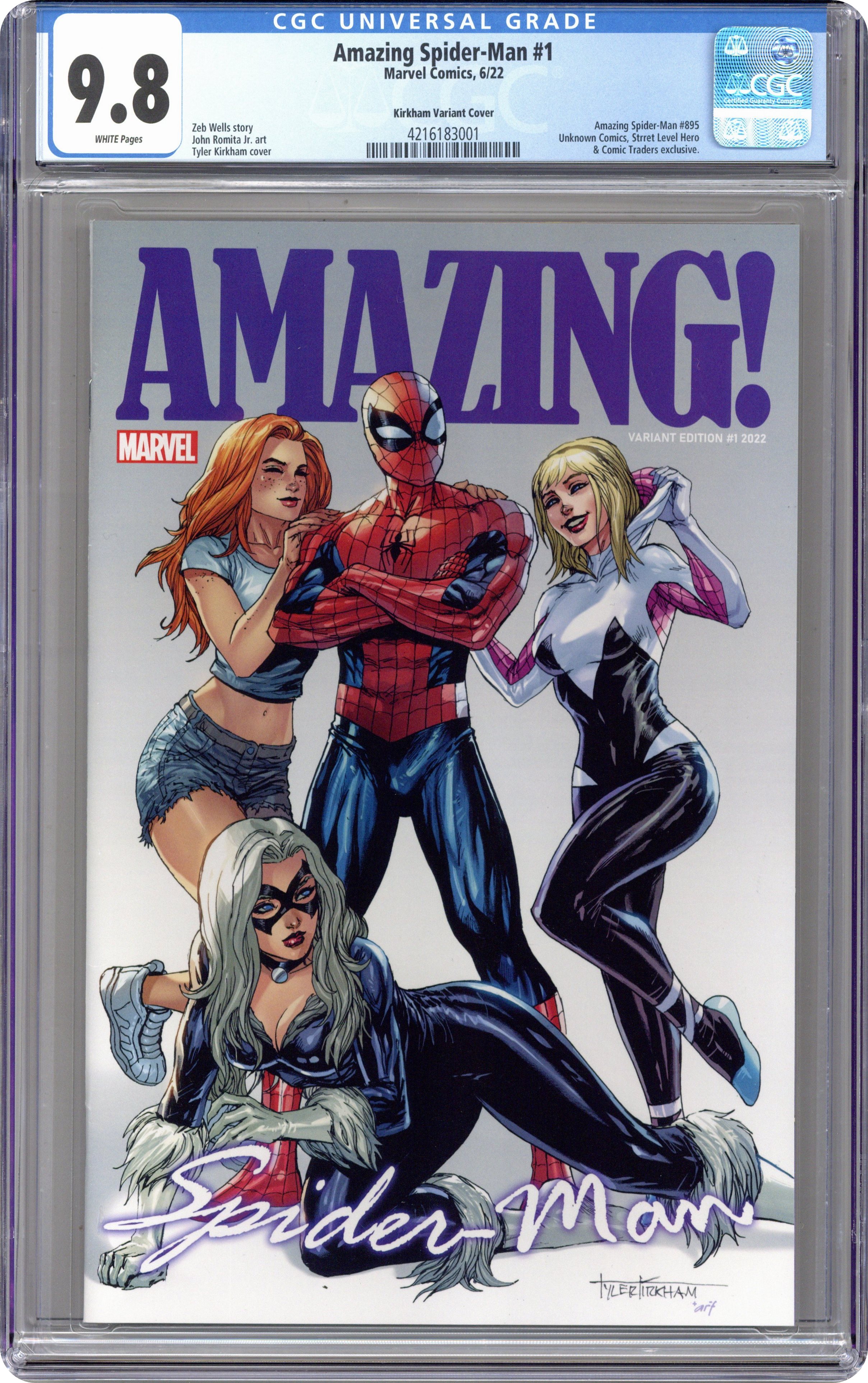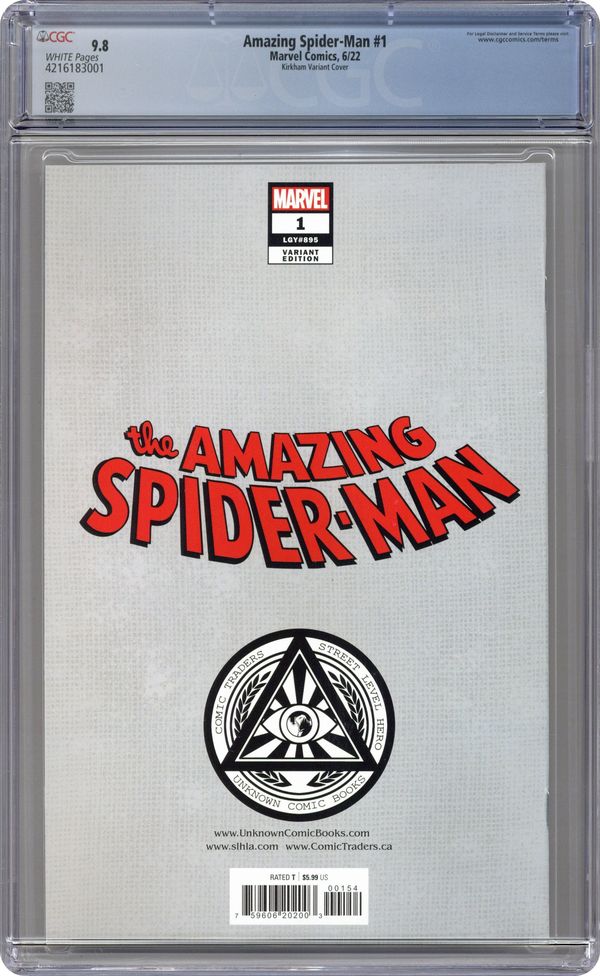 Ended Mar 5 2024 Winning Bid $38 Comics Illuminati (Unknown Comics, Street Level Hero, and Comic Traders) exclusive cover by Tyler Kirkham. Written by Zeb Wells. Art by John Romita Jr. and Scott Hanna. WHAT DID SPIDER-MAN DO?! Peter's on the outs with the FF. He's on the outs with the Avengers. He's on the outs with Aunt May! No one wants to see Spider-Man - except for Doctor Octopus. Ock's on Spider-Man's tail and the Master Planner has something truly terrible planned for when he gets his tentacles on Spidey. All that, and what does Tombstone have planned? Just in time for Spider-Man's 60th Anniversary, a new volume of AMAZING SPIDER-MAN begins, and 2022 is going to be the biggest year for Spider-Man EVER! Don't believe us? We brought John Romita Jr. back JUST FOR THIS! 56 pages, full color. Rated T Grade: CGC 9.8 explanation of grade Condition: Used (collectible)