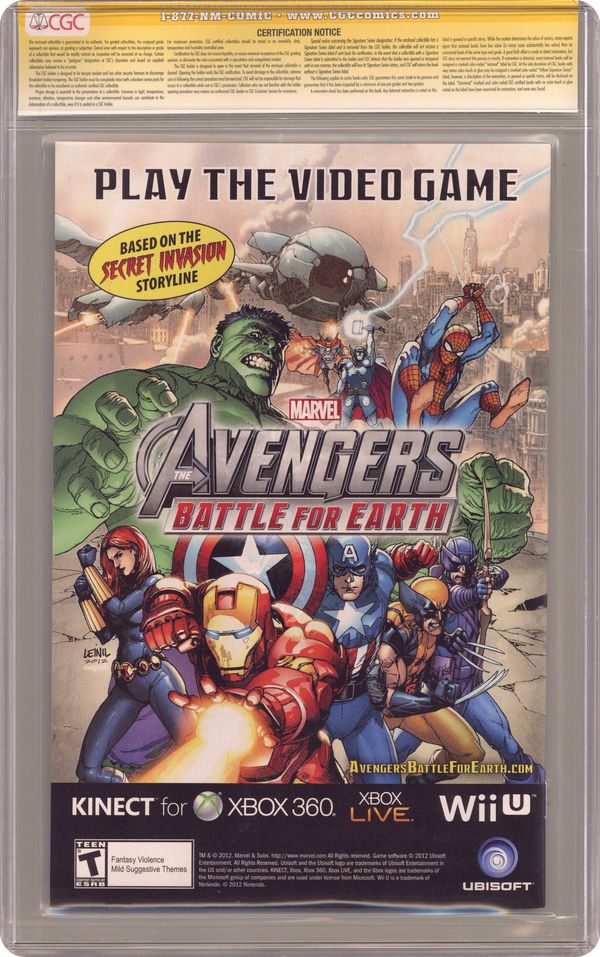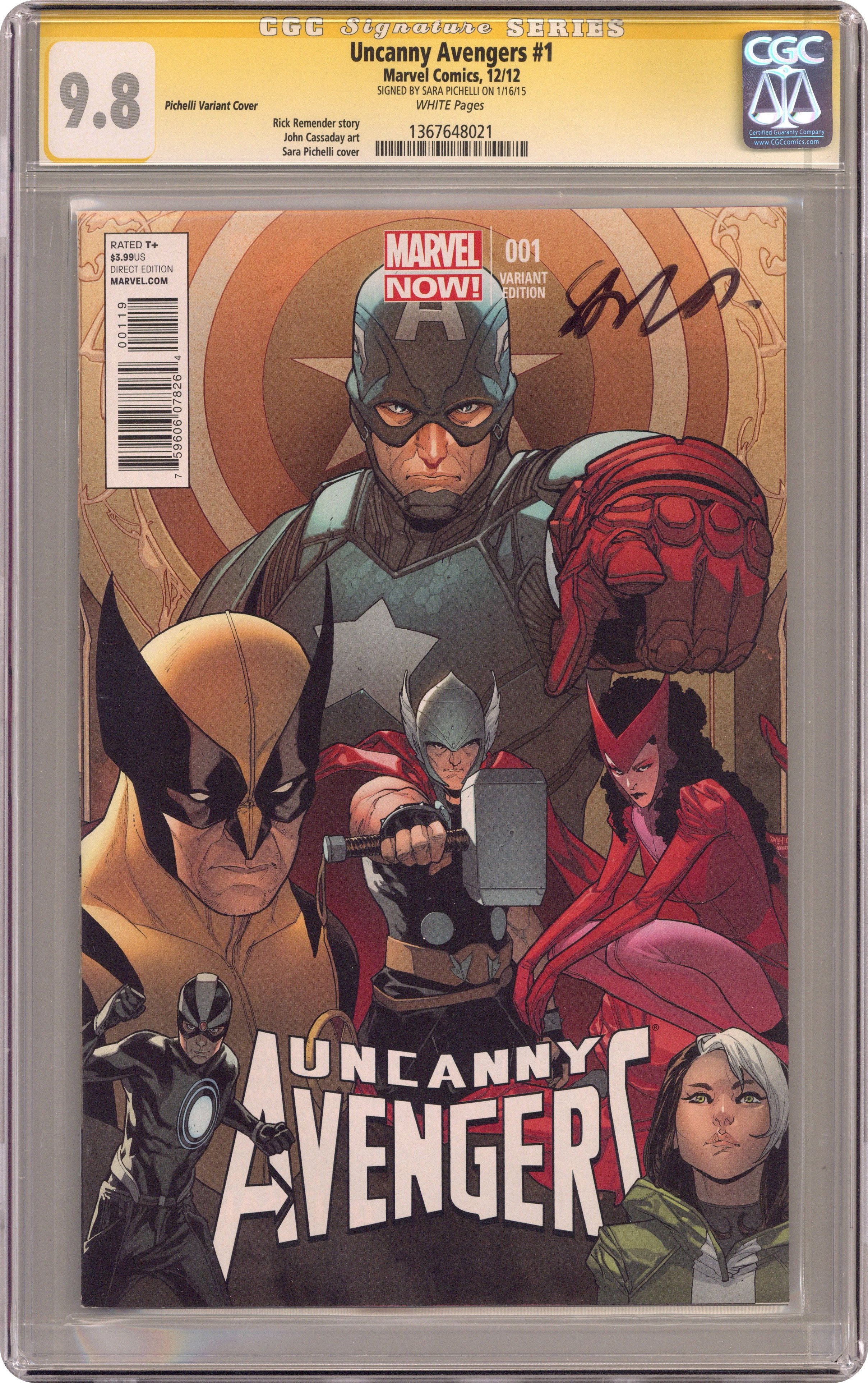 Limited Variant Cover by Sara Pichelli (W) Rick Remender (A) John Cassaday THIS IS IT! The greatest era of the Marvel Universe starts here! From the ashes of AvX an all-new, all-different Avengers assemble! Dive headfirst into Marvel NOW! as the superstar dream team of Rick Remender (Uncanny X-Force, Venom) and John Cassaday (Astonishing X-Men, Captain America) deliver high stakes action in UNCANNY AVENGERS #1 - sporting a jaw-dropping cover by Cassaday! No fan can miss the blockbuster debut of an all-new Avengers team featuring members from all across the Marvel Universe...a team uniting Avenger and X-Man alike! Captain America begins his quest to create a sanctioned Avengers unit comprised of Avengers and X-Men, humans and mutants working together - so why is Professor Xavier's dream more at risk than ever? The funeral of one of Marvel's greatest heroes! The first attack of the most loathsome villain in history will quake the Marvel Universe forever! But following the devastating events of Avengers VS X-Men, can Captain America pull together a team that can get along for its first mission? Cover price $3.99. Grade: CGC 9.8 explanation of grade Condition: Used (collectible)