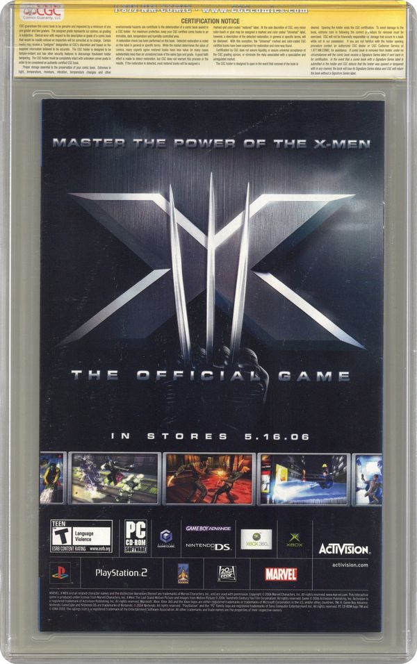 Ended Nov 14 2024 Winning Bid $40 1st Printing. Written by MARC GUGGENHEIM Pencils & Cover by HUMBERTO RAMOS. CIVIL WAR TIE-IN! "VENDETTA" In the aftermath of the Stamford Massacre, Logan makes it his personal mission to take down the man responsible. But someone else is hunting the same prey: a mysterious trio whose identity -- and mission -- will send shockwaves through the Marvel Universe in the months to come. If Logan wants dibs on his prey, then he's going to have to go through them. Part 2 (of 6). 32 PGS./Parental Advisory Cover price $2.99. Grade: CGC 9.8 explanation of grade Condition: Used (collectible)
