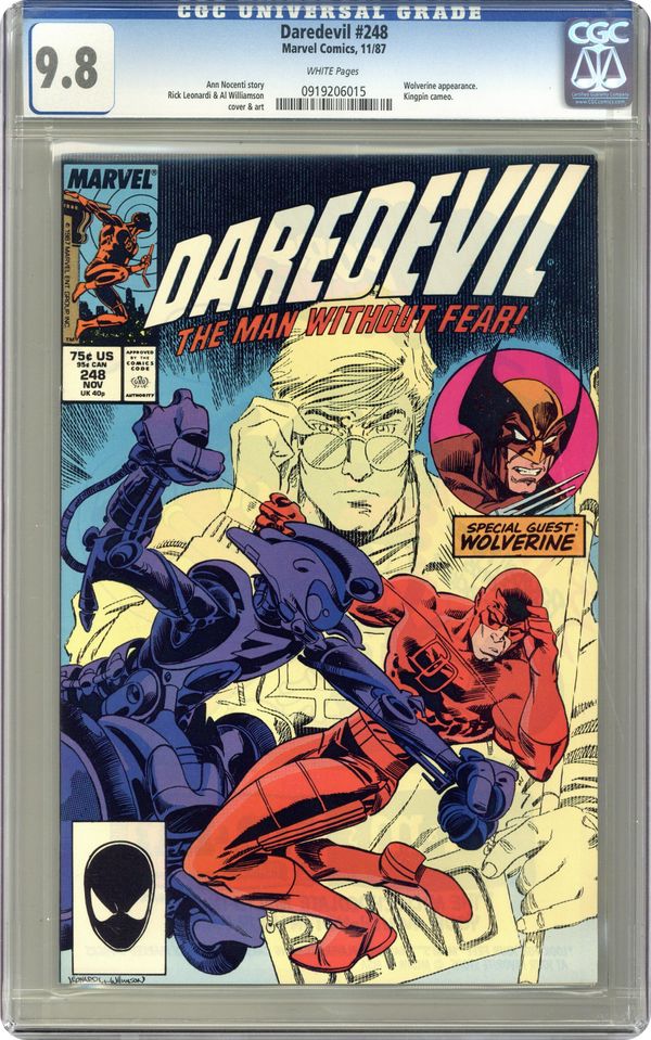 Direct Edition. Cover pencils by Rick Leonardi, inks by Al Williamson. A Cage In Search of a Bird..., script by Ann Nocent, pencils by Rick Leonardi, inks by Al Williamson; Karen convinces Matt to open a free legal hotline; Foggy is working for a big company run by the Kingpin; DD tries to investigate a company whose toxic waste blinded a little boy; Wolverine is on the trail of the mutant-killing Bushwacker. 32 pgs. Cover price $0.75. Cover price $0.75. Grade: CGC 9.8 explanation of grade Condition: Used (collectible)