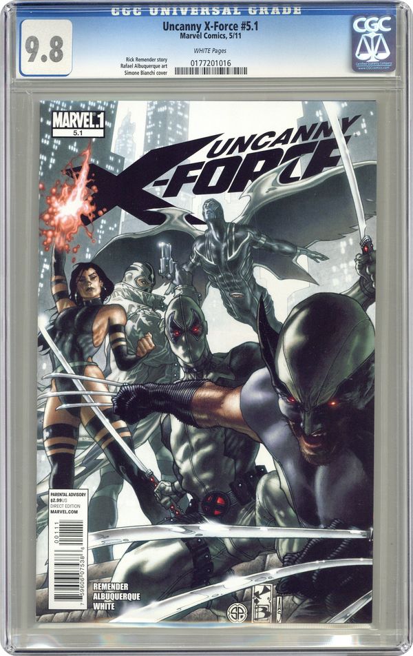 Written by RICK REMENDER Penciled by RAFAEL ALBUQUERQUE Cover by SIMONE BIANCHI Special Point One issue. START READING with this Point One issue. When a situation calls for hard choices, the X-Force is there to step in. Lady Deathstrike, with the deadly Reavers at her side, set out to destroy the X-Men in their home! Deathstrike will obliterate the X-Men or die trying, and this new Uncanny X-Force is more than happy to oblige. As the line between right and wrong become more and more blurred, will the Uncanny X-Force be heralded as heroes...or villains? 32 PGS./Parental Advisory Cover price $2.99. Grade: CGC 9.8 explanation of grade Condition: Used (collectible)