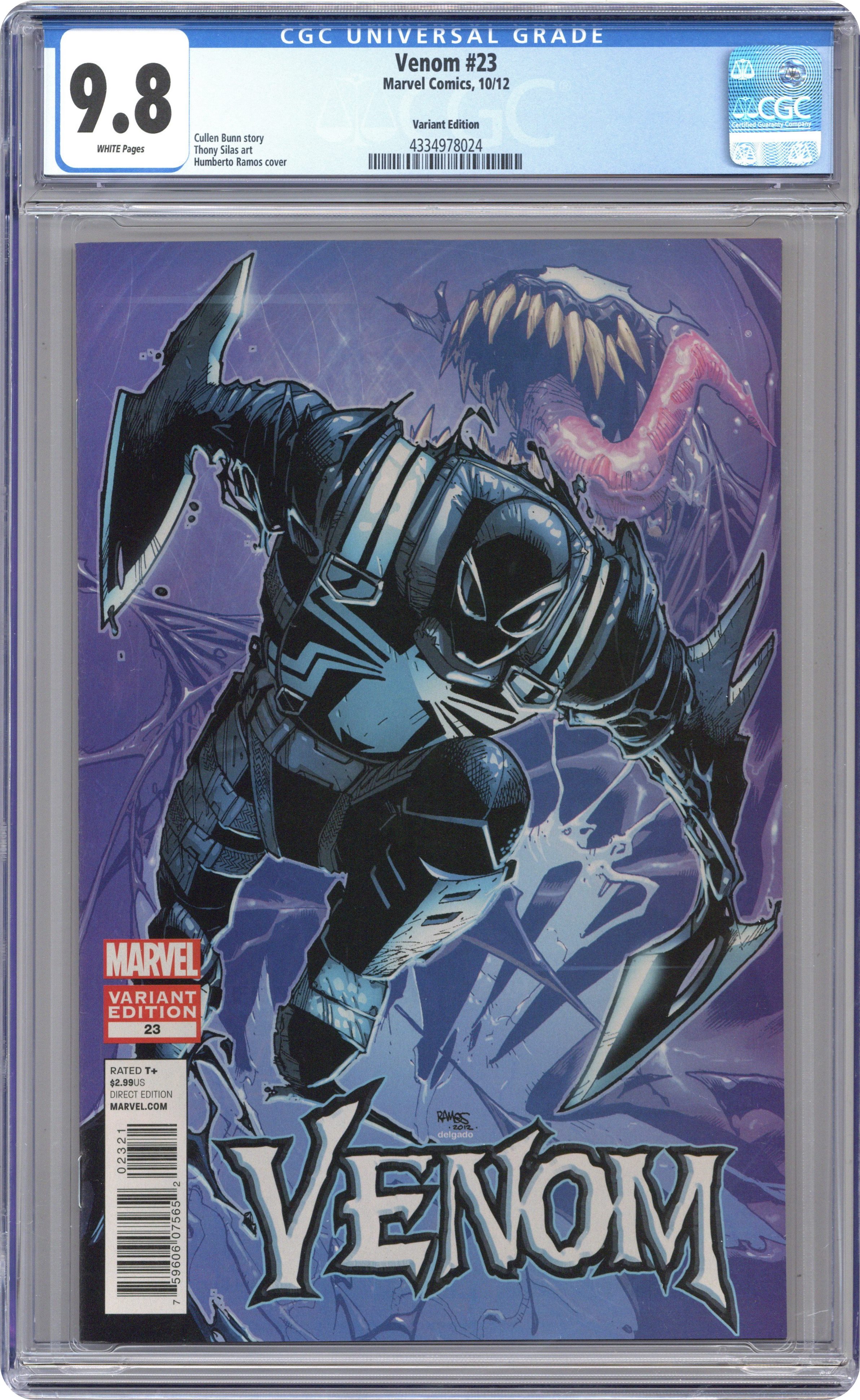 Limited 1 for 30 Variant Cover by Humberto Ramos (W) Cullen Bunn (A) Thony Silas 'THE MONSTERS OF EVIL' A NEW ERA OF SYMBIOTE-SUPER HEROICS BEGINS! The Avengers task Venom with bringing in Damion Hellstrom - but who are THE MONSTERS OF EVIL?! Rising star Cullen Bunn (WOLVERINE) teams with the Spider-verse's newest young gun, Thony Silas(ENDS OF THE EARTH) for a new dawn in the life of Flash Thompson! Cover price $2.99. Grade: CGC 9.8 explanation of grade Condition: Used (collectible)