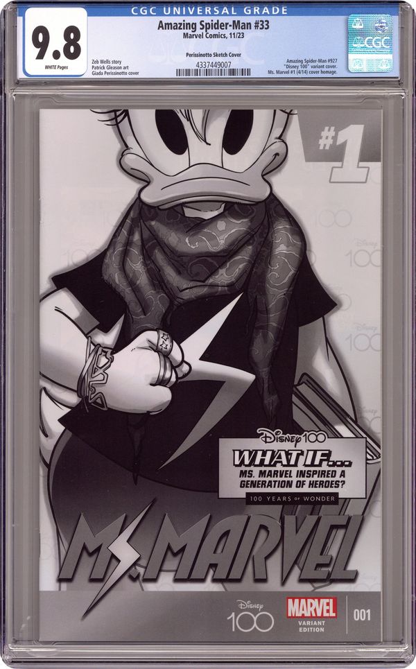 Ended Dec 7 2023 Winning Bid $186 NOTE: This is a variant cover for Amazing Spider-Man #33, NOT Ms. Marvel. Limited 1 for 100 Retailer Incentive Variant Cover. Written by Zeb Wells. Art by Patrick Gleason. Cover by Giada Perissonotto. SPIDER-MAN'S FIRST HUNT! The hunter is now the prey. Can Kraven survive? 32 pages, full color. Rated T Cover price $3.99. Grade: CGC 9.8 explanation of grade Condition: Used (collectible)