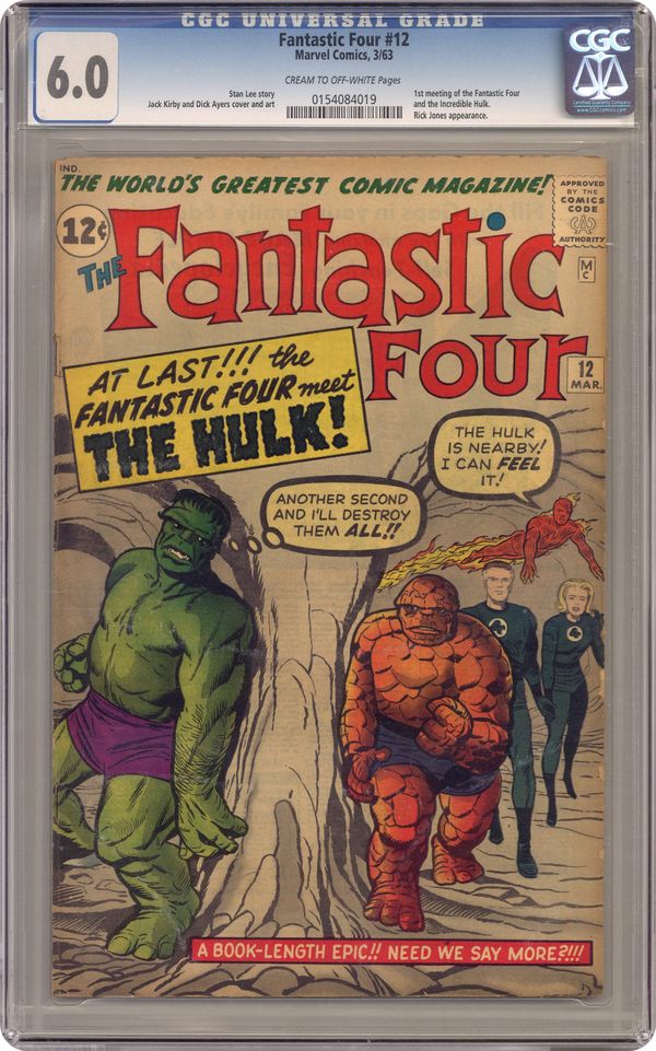 Ended Jan 21 2024 Winning Bid $1,702 Cover pencils by Jack Kirby, inks by Dick Ayers. The Incredible Hulk, script by Stan Lee, pencils by Jack Kirby, inks by Dick Ayers; General Ross asks the Fantastic Four "to find and destroy the Hulk". His base was victim of a saboteur and Hulk is the only suspect. Part 2 Mission: Stop the Hulk!; The Fantastic Four goes to a briefing at the base in New-Mexico; There, they meet Bruce Banner and his assistant, Karl Kort, to discuss how to stop the Hulk. Part 3 Who Is the Wrecker?; Rick Jones identifies Karl Kort as the saboteur. Part 4 "The Hulk ar Last!"; Karl Kort brings Rick in caves where Hulk and the Fantastic Four are searching for him. 36 pgs. $0.12. Cover price $0.12. Grade: CGC 6.0 explanation of grade Condition: Used (collectible)