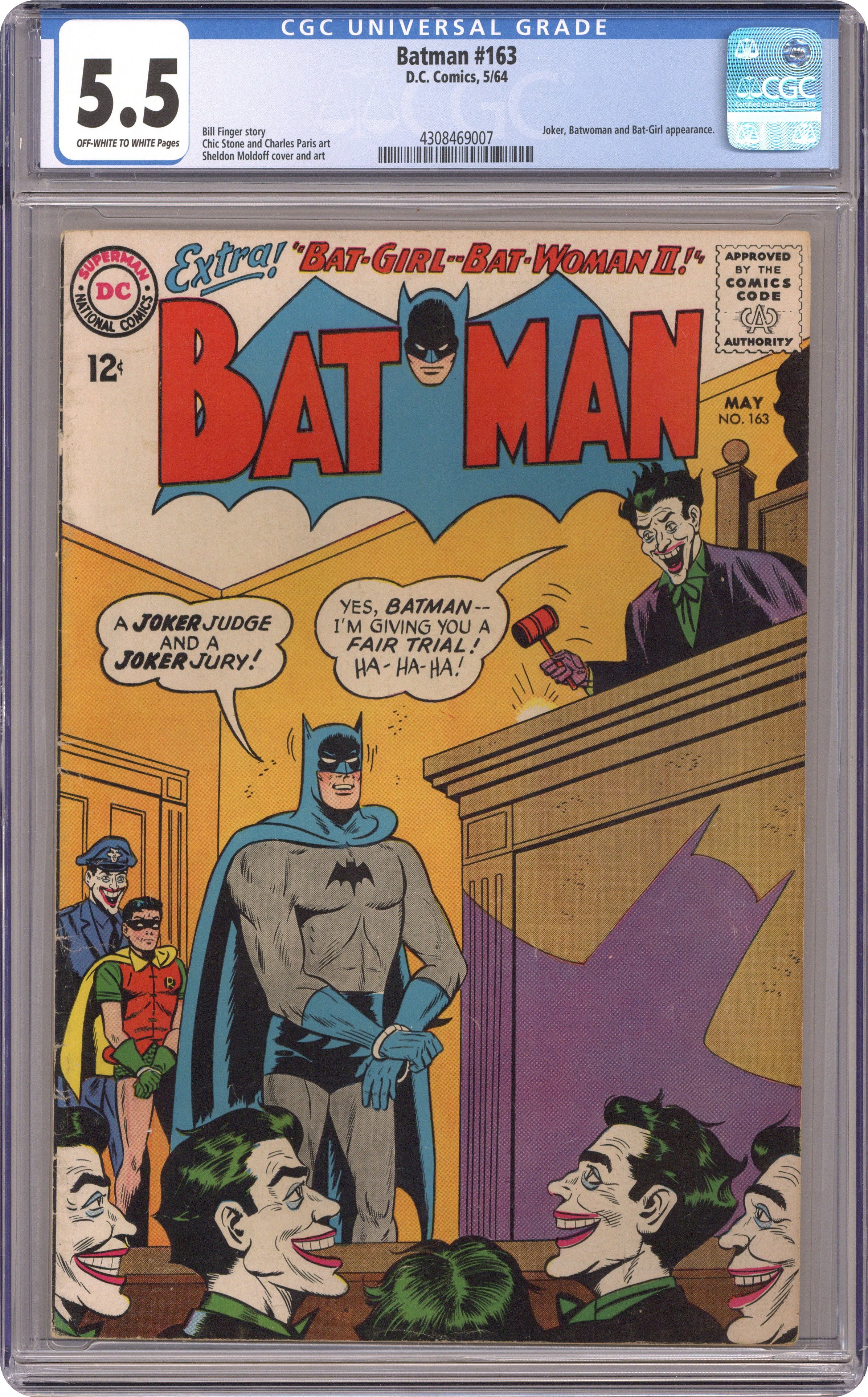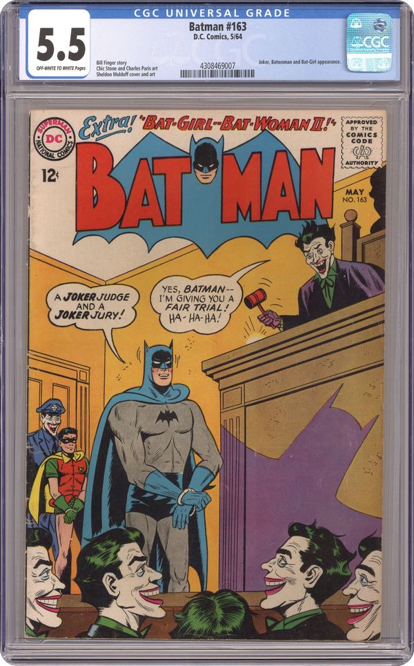 Ended Mar 11 2024 Winning Bid $215 Cover art by Sheldon Moldoff. "Bat-Girl--Batwoman II!", script by Bill Finger, pencils by Chic Stone, inks by Charles Paris; Betty returns to Gotham City and adopts the guise of Batwoman II; With Batman and Robin II both out of town, the original Batman must go into action and gets captured in the process; When Batwoman II saves him, she learns his secret identity in the process. "The Joker Jury!", script by Bill Finger, pencils by Sheldon Moldoff, inks by Charles Paris; The Joker begins a crime wave using the city's various departments as his theme; When the Caped Crusaders head out to battle the Crime Clown, they are captured and put on trial by the Joker. Names Do Hurt! public service announcement, art by Sheldon Moldoff. 36 Pages, Full Color. Cover price $0.12. Grade: CGC 5.5 explanation of grade Condition: Used (collectible)