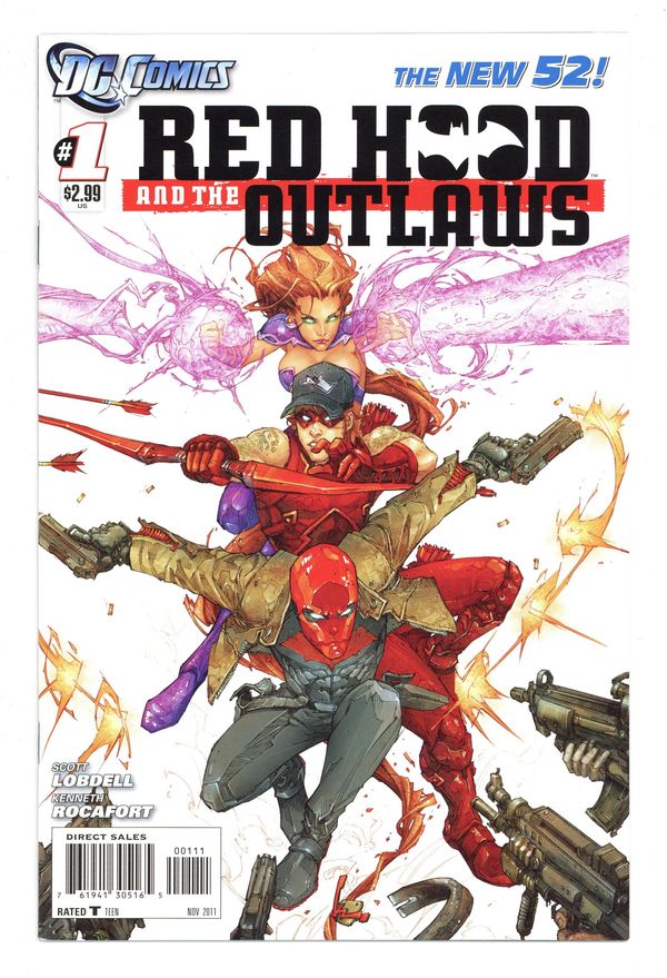 FIRST PRINTING Written by SCOTT LOBDELL Art and cover by KENNETH ROCAFORT No sooner has Batman's former sidekick, Jason Todd, put his past as the Red Hood behind him than he finds himself cornered by a pair of modern day outlaws: Green Arrow's rejected sidekick Arsenal, the damaged soldier of fortune, and the alien Starfire, a former prisoner of intergalactic war who won't be chained again. As a loner, Jason has absolutely no interest in this motley crew of outlaws. So what's he going to do when they choose the Red Hood as their leader? Find out in this hot new series from writer Scott Lobdell (WILDC.A.T.S, Uncanny X-Men), featuring art by rising star Kenneth Rocafort (ACTION COMICS)! Cover price $2.99. Grade: FN 6.0 explanation of grade Condition: Used (collectible)