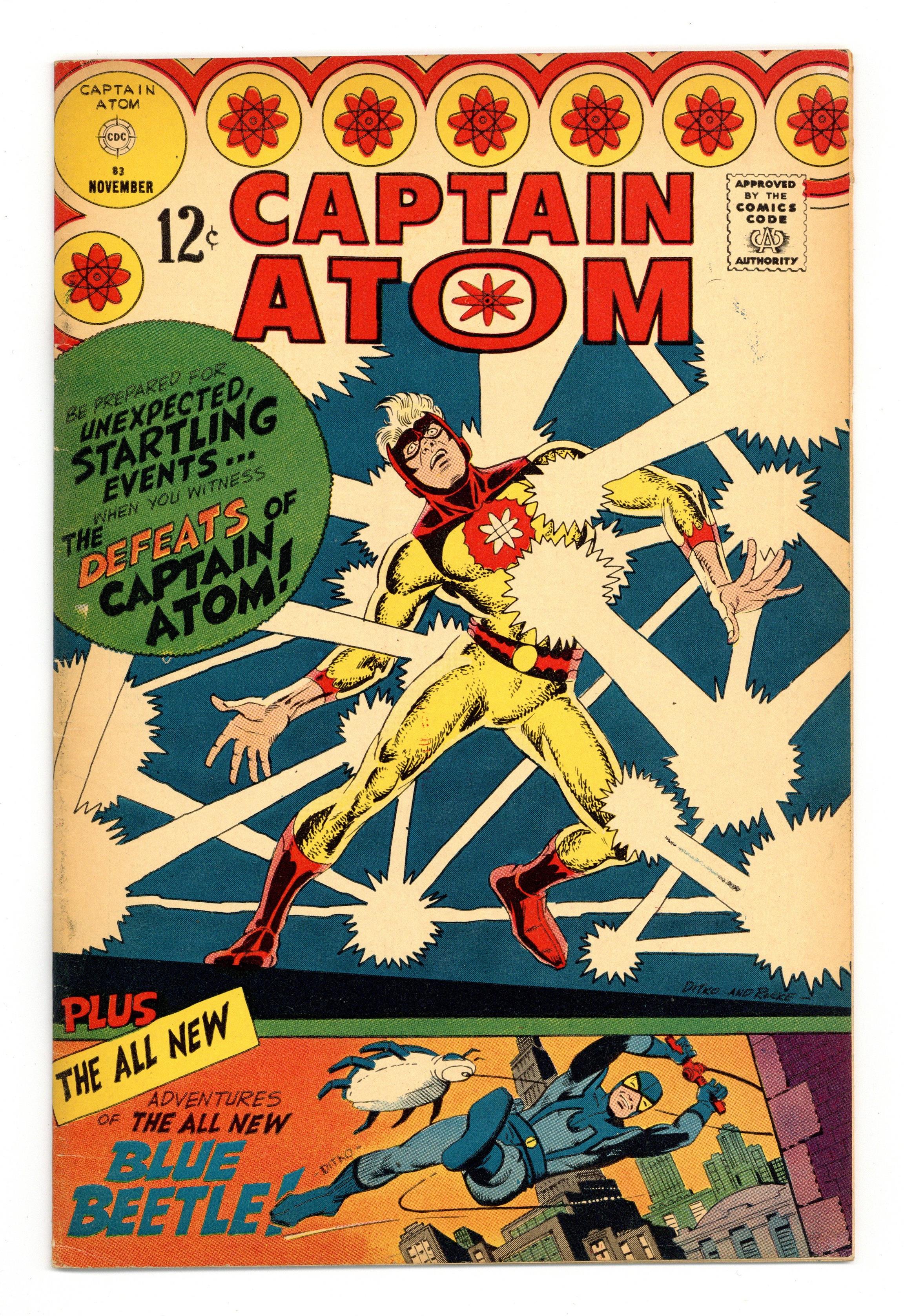 First appearance of Ted Kord (second Blue Beetle). Cover pencils by Steve Ditko, inks by Rocke "Rocke" Mastroserio. Finally Falls the Mighty!, script by Steve Ditko (plot) and David Kaler, pencils by Steve Ditko, inks by Rocco "Rocke" Mastroserio; Captain Atom loses his powers; cameo by Iron Arms. The New Blue Beetle, script by Steve Ditko (plot) and Gary Friedrich, art by Steve Ditko; intro of Blue Beetle/Ted Kord. 36 pgs. $0.12. Cover price $0.12. Grade: VG+ 4.5 explanation of grade Condition: Used (collectible)