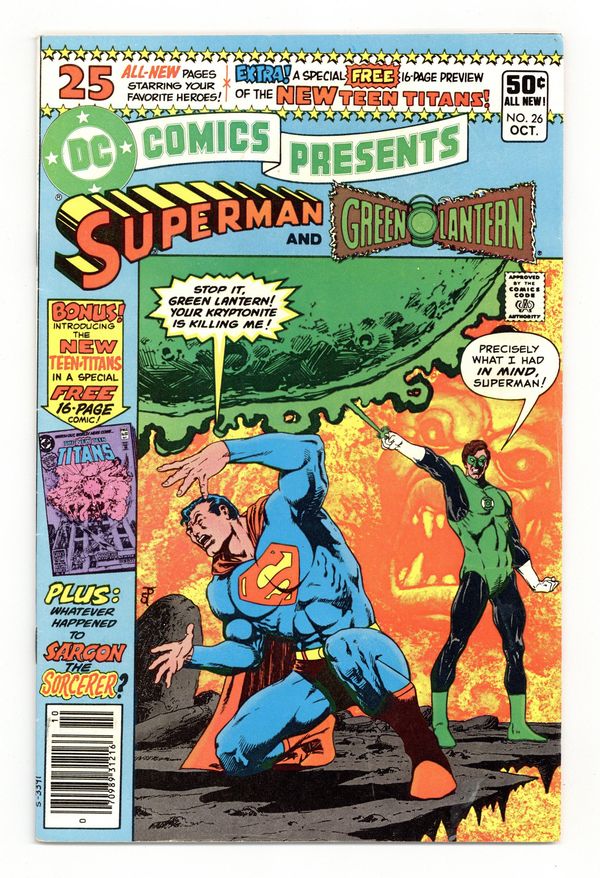 Direct Edition. 1st appearance of the New Teen Titans in preview story; 1st appearances of Raven, Cyborg and Starfire. Cover by Jim Starlin. Stories by Jim Starlin, Marv Wolfman and Bob Rozakis. Art by Jim Starlin, George Pérez, José Delbo, Steve Mitchell, Dick Giordano and Kim DeMulder. N'Gon is attempting to gain power by taking it from other super-beings, but Superman and Green Lantern combine forces to imprison N'Gon in "Between Friend and Foe!" by Jim Starlin (plot and pencils), Marv Wolfman (script) and Steve Mitchell (inks). Characters in this story: Green Lantern [Hal Jordan]; Superman [Clark Kent]; Green Lantern [Archon Z'Gmora]; N'Gon (villain); Archie Jones. Plus: Raven uses her powers to enter Dick Grayson's dreams to show him a scene from the not-too-distant future of the new Teen Titans team battling to save the world from an other-dimensional protoplasmic creature in "Where Nightmares Begin!" by Marv Wolfman, George Pérez and Dick Giordano. Characters in this story: Teen Titans [Changeling [Garfield Logan] (introduction as Changeling); Cyborg [Victor Stone] (introduction); Kid Flash [Wally West]; Raven (introduction); Robin [Dick Grayson]; Starfire [Koriand'r] (introduction); Wonder Girl [Donna Troy]]; Silas Stone (introduction); an other-dimensional protoplasm (villain). Story continues in New Teen Titans (1980) (Tales of ...) #1. Also: The Matter Master attempts to steal the Ruby of Life but Sargon stops him in the back-up story "Whatever Happened to Sargon the Sorcerer?" by Bob Rozakis, José Delbo and Kim DeMulder. Characters in this story: Justice League of America [The Atom [Ray Palmer] (flashback); Batman [Bruce Wayne] (flashback); The Flash [Barry Allen] (flashback); Green Arrow [Oliver Queen] (flashback); Hawkman [Katar Hol/Carter Hall] (flashback); Superman [Clark Kent] (flashback); Wonder Woman [Diana Prince] (flashback)]; The Matter Master [Mark Mandrill] (villain); Sargon the Sorcerer [John Sargent]. And: Hawkman vs. Golden Raven in 1-page Hostess Fruit Pies ad "She's No Angel" with pencils by Curt Swan. 48 pages, full color. Cover price $0.50. Grade: VG 4.0 explanation of grade Condition: Used (collectible)