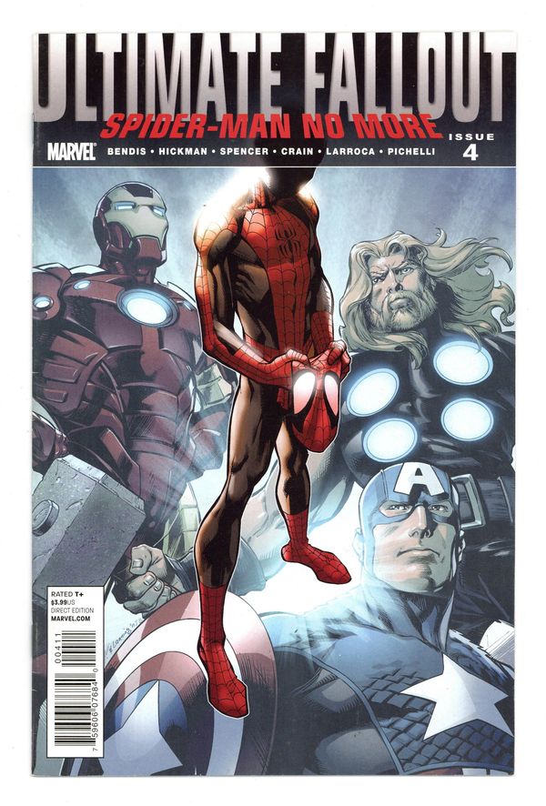 Direct Edition. 1st appearance of Miles Morales. Written by BRIAN BENDIS, JONATHAN HICKMAN & NICK SPENCER. Art by SARA PICHELLI, SALVADOR LARROCA & CLAYTON CRAIN. Cover by MARK BAGLEY. What will become of Captain America? Where have all the X-Men gone? And what is up with the new Spider-Man suit? Don't miss the final chapters of one of the most talked about Ultimate events ever. 36 PGS. (each)/Rated T+...$3.99 (each) Cover price $3.99. Grade: FN- 5.5 explanation of grade Condition: Used (collectible)