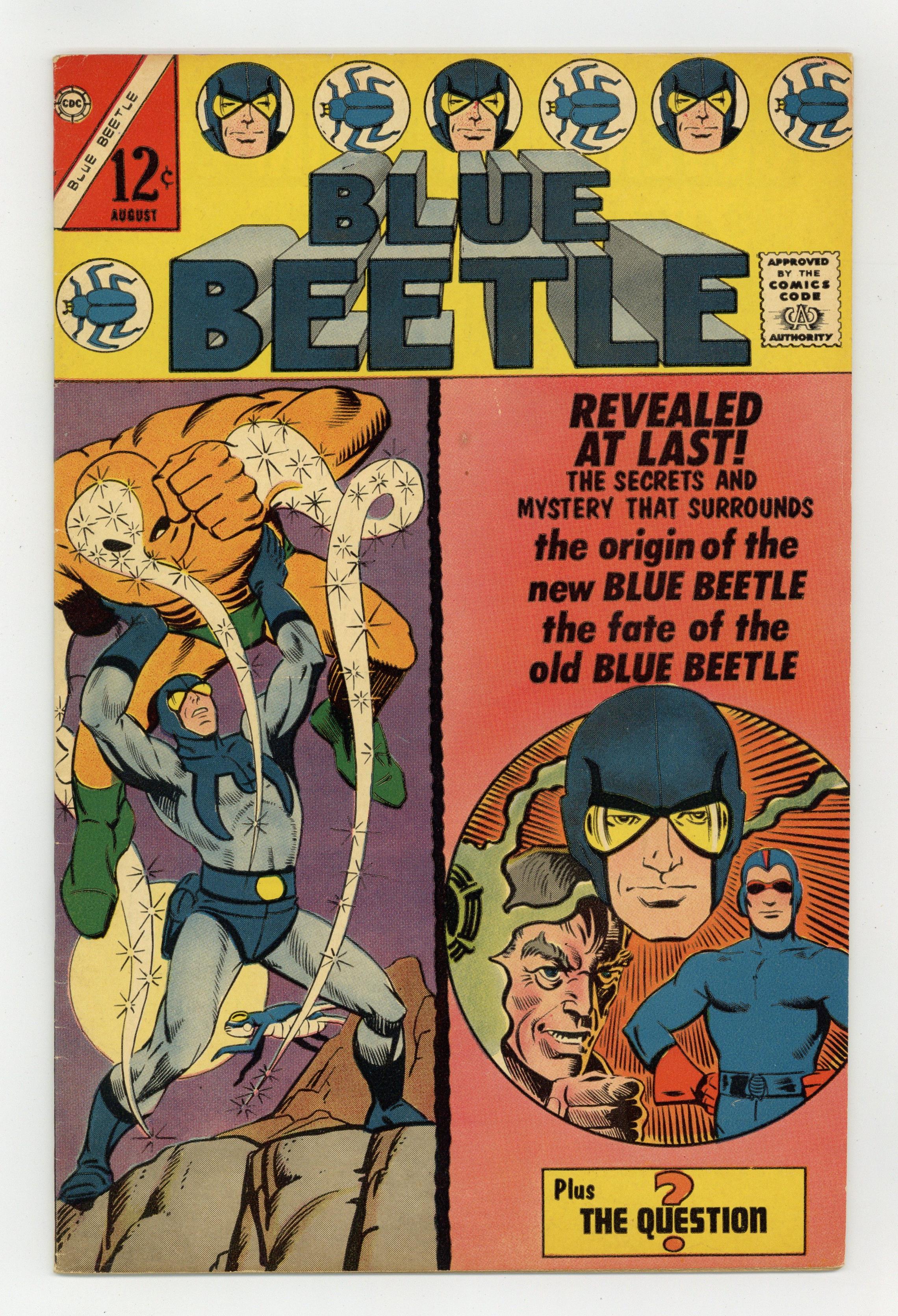 Cover by Steve Ditko. Stories and art by Steve Ditko, David Charles Glanzman and Dick Giordano. The third (or fourth, depending on how you count it) Charlton series to feature the Blue Beetle introduces the Silver Age BB, Ted Kord. The origin of the new Blue Beetle is revealed, as well as his connection to Dan Garrett, the Golden Age Blue Beetle. (Both heroes inspired characters in Alan Moore's Watchmen, as did The Question.) The faceless crimefighter The Question must find a way to silence the sinister Banshee. The End Is a Beginning!; The Question vs. the Banshee. 32 pages, Full Color. Cover price $0.12. Grade: FN 6.0 explanation of grade Condition: Used (collectible)