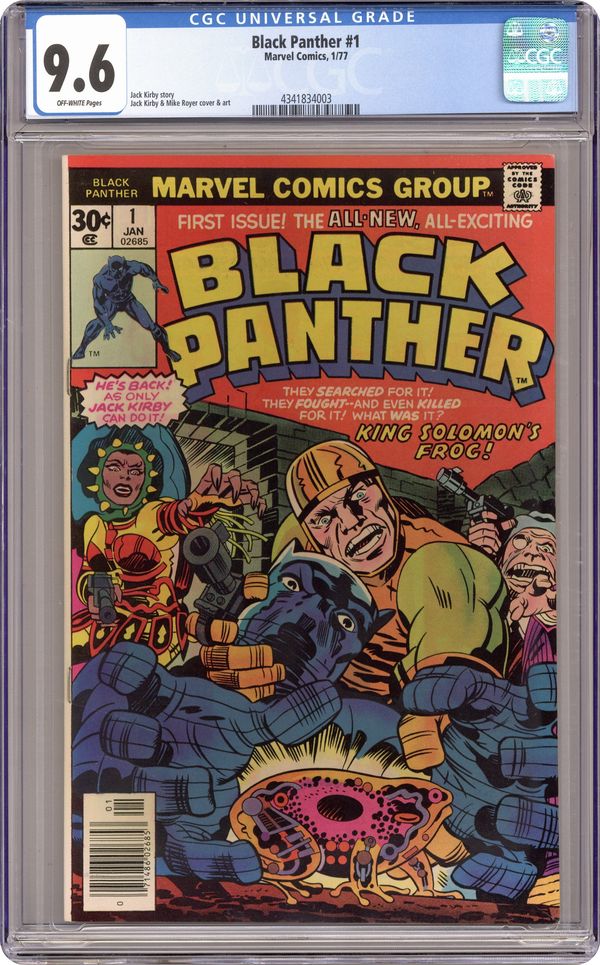Ended Dec 29 2023 Winning Bid $205 Cover pencils by Jack Kirby, inks by John Verpoorten. King Solomon's Frog!, script and pencils by Jack Kirby, inks by Mike Royer; Black Panther helps Abner Little, a member of the Collectors, recover the Brass Frog, an ancient time machine; Due to its dangerous nature, the Frog had previously been hidden away by the Black Panther's grandfather, Azzuri, but was taken by Alfred Queely, a fellow member of the Collectors; After getting the Frog, the Black Panther and Little are attacked by Princess Zanda, another member of the Collectors, for control of the artifact. During the battle, the Frog is activated and a mysterious creature, Hatch-22, appears. Jack Kirby writes about what readers can expect from his new Black Panther. 36 pgs. $0.30. Cover price $0.30. Grade: CGC 9.6 explanation of grade Condition: Used (collectible)
