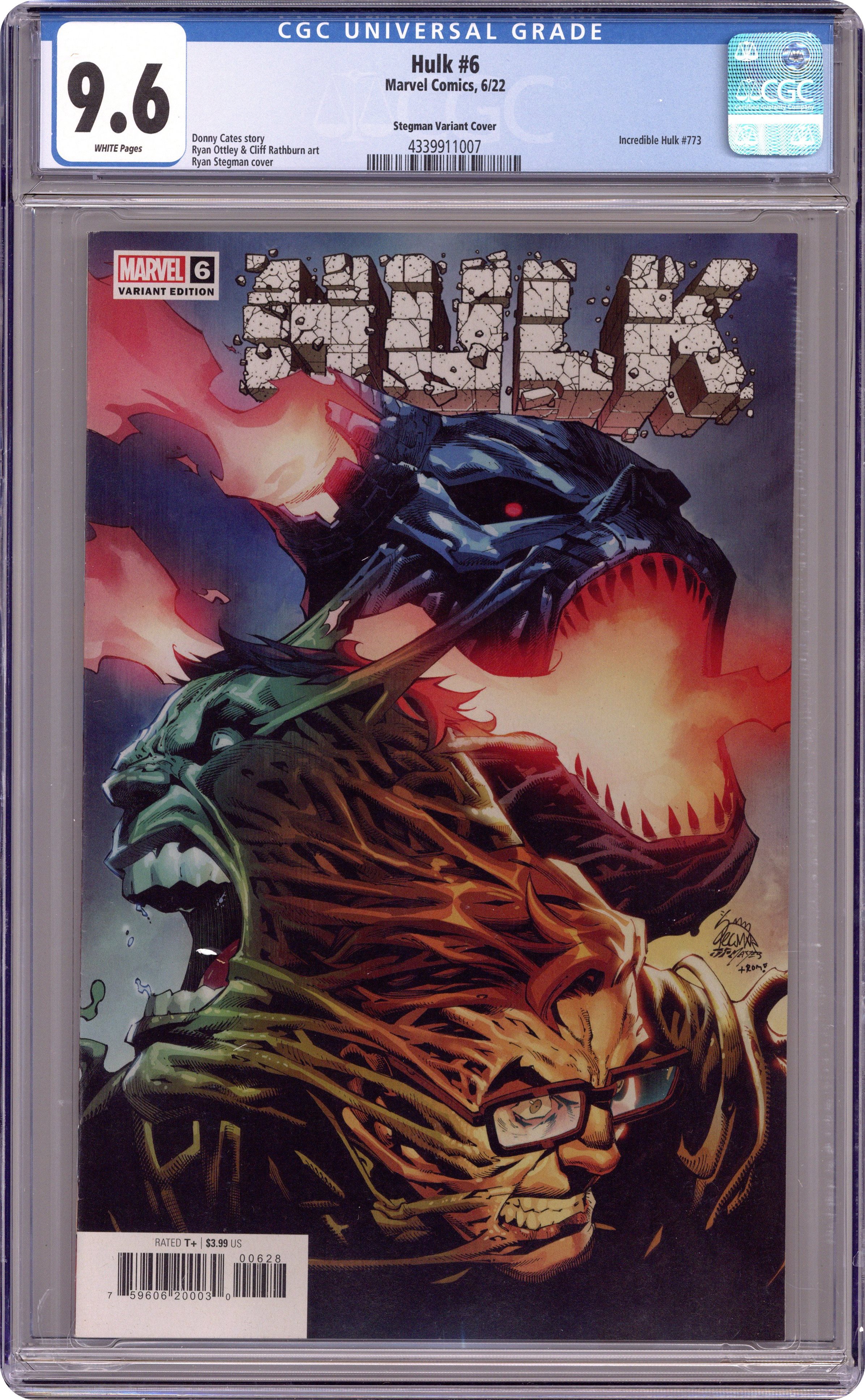 Ended Jan 20 2024 Winning Bid $66 Limited 1 for 500 Retailer Incentive Variant Cover. Written by Donny Cates. Art by Ryan Ottley. Cover by Geoff Shaw; UNASSIGNED. "SMASHTRONAUT" Part 6 of 6! The first arc of Donny Cates and Ryan Ottley's mind-blowing Hulk saga reaches its epic climax as Bruce Banner's control over Starship Hulk slips…and something much worse takes the wheel… 28 pages, full color. Rated T+ Cover price $3.99. Grade: CGC 9.6 explanation of grade Condition: Used (collectible)