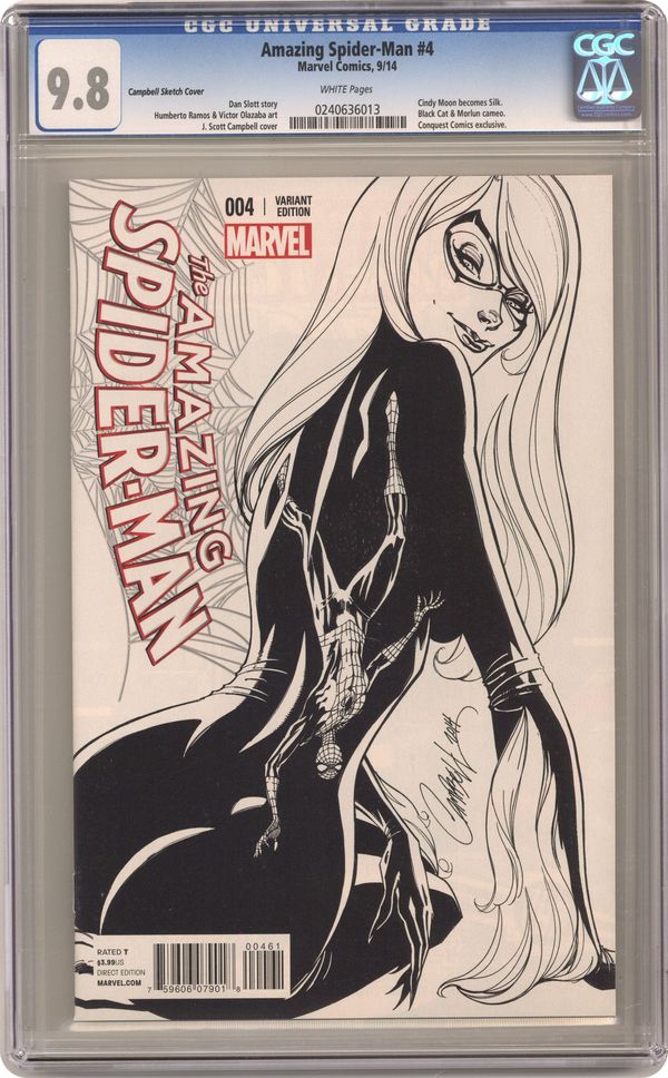 Ended Jan 21 2024 Winning Bid $380 Conquest Comics Sketch Variant by J. Scott Campbell. 1st appearance of Silk. Written by Dan Slott. Art and Cover by Humberto Ramos. ORIGINAL SIN tie-in! The radioactive spider that gave Peter Parker his powers bit someone else, too! Who is Silk and where has she been? Don't miss this incredible new character who will be a major Spider-player for the whole year! 28 pages, full color. Cover price $3.99. Grade: CGC 9.8 explanation of grade Condition: Used (collectible)
