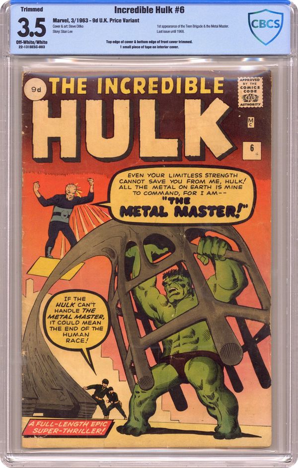 Ended Jan 21 2024 Winning Bid $302 UK edition. Identical to US edition, but has 9d cover price. Cover by Steve Ditko. Introduction of the Teen Brigade in "The Incredible Hulk vs The Metal Master!," script by Stan Lee, art by Steve Ditko; Finding his transformations more and more difficult using his gamma ray machine, the Hulk with Banner's brain also finds that he has Banner's features when he zaps himself to face the alien invading Metal Master and his head does not transform; The power of the Metal Master is too much for the Hulk and he is captured by Ross. Rick forms the Teen Brigade; Hulk breaks free of Ross's bunker and then pulls off one of the boldest victories against one of the most powerful aliens ever seen. 36 pgs., full color. The Hulk's solo adventures continue in the pages of Tales to Astonish (1959-1968 1st Series) #59. Grade: CBCS 3.5 explanation of grade Condition: Used (collectible)
