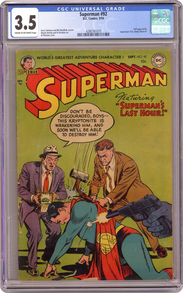 Ended May 15 2024 Winning Bid $96 Cover art by Win Mortimer. The Impossible Headlines starring Superman, Jigger Benson, and George Earns (briefly edits the PLANET), pencils by Wayne Boring, inks by Stan Kaye. Superman's Sweetheart, script by Bill Woolfolk, art by Al Plastino; time-travel story. Little Pete humor two-pager by Henry Boltinoff. The Secret of Sam Trask's Pet text story. Superman's Last Hour starring Superman, Nails Harrigan, and Dan Delta, script by Jerry Coleman, art by Al Plastino. Full-page ad for Jimmy Olsen #1. 44 Pages, Full Color. Cover price $0.10. Grade: CGC 3.5 explanation of grade Condition: Used (collectible)