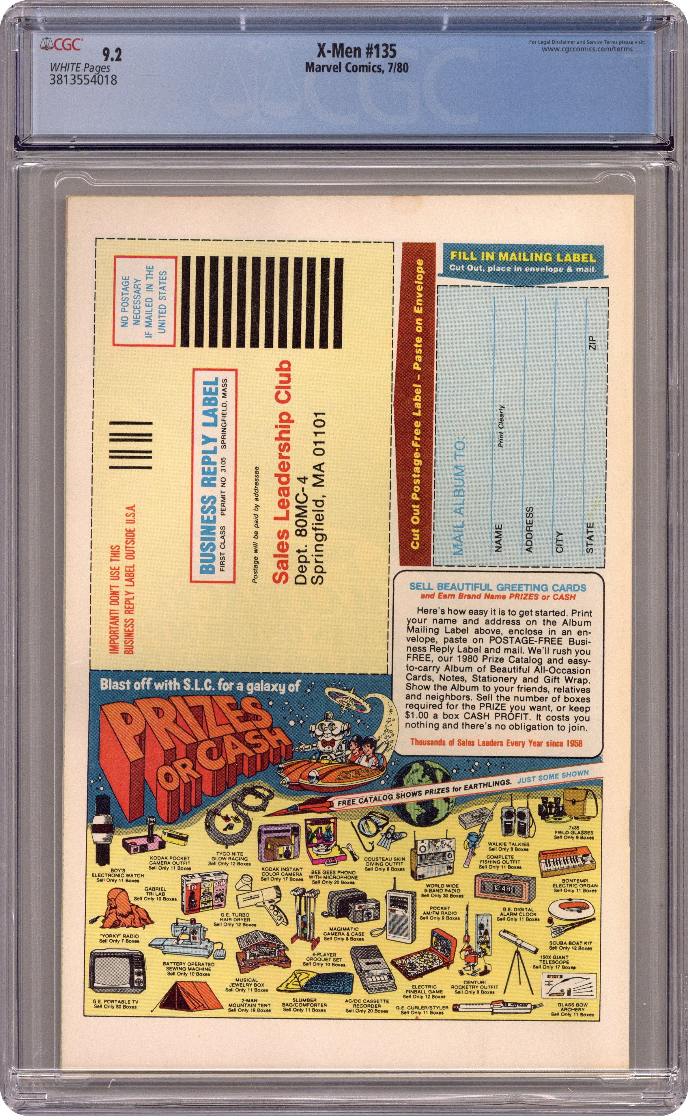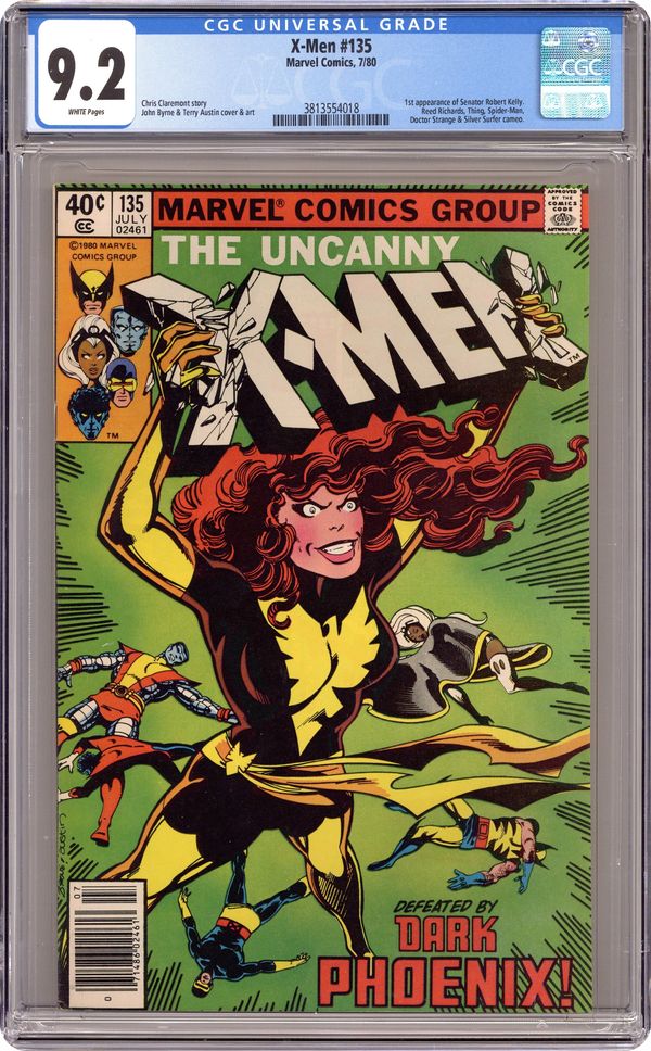 Newsstand Edition. The Dark Phoenix Saga: Part 7 of 9 - "Dark Phoenix!" Cameos by the Fantastic Four, Spider-Man, Doctor Strange, and the Silver Surfer. Story by Chris Claremont and John Byrne. Art by John Byrne and Terry Austin. The unfettered might of the Dark Phoenix is unleashed upon an unsuspecting universe, and the repercussions oar terrible. What can the X-Men do to stop their teammate who has gone mad with unimaginable power? 36 pgs. Cover price $0.40. Grade: CGC 9.2 explanation of grade Condition: Used (collectible)