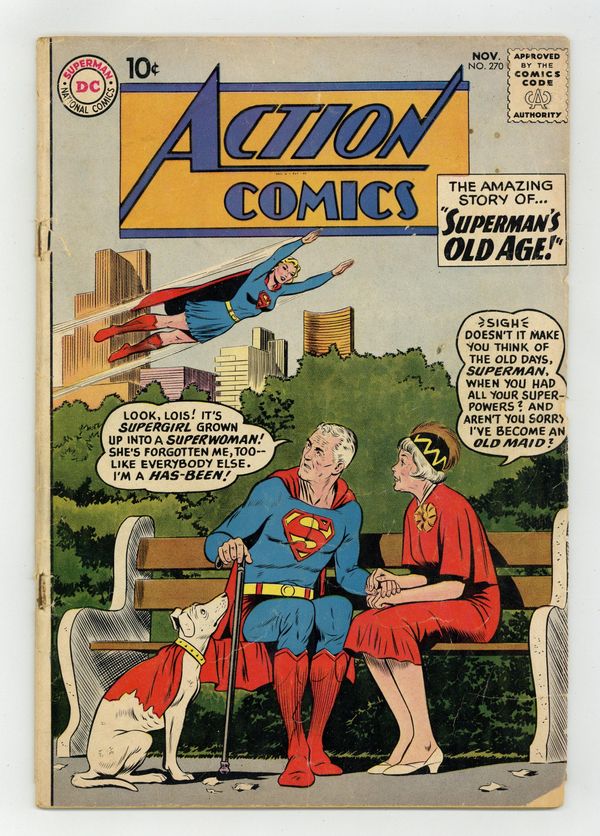 Cover pencils by Curt Swan, inks by Stan Kaye. "The Old Man of Metropolis!", script by Otto Binder, pencils by Curt Swan, inks by John Forte; Superman inadvertently smashes through the time barrier into the future - but emerges as an old man with no super powers. "Supergirl's Busiest Day!", script by Jerry Siegel, art by Jim Mooney; With Superman on a space mission, Supergirl has a day full of emergencies to deal with. One-page Shorty story by Henry Boltinoff. Supermen of America ad. Justice League of America ad. 36 Pages, Full Color. $.10 Cover price $0.10. Grade: GD+ 2.5 explanation of grade Condition: Used (collectible)