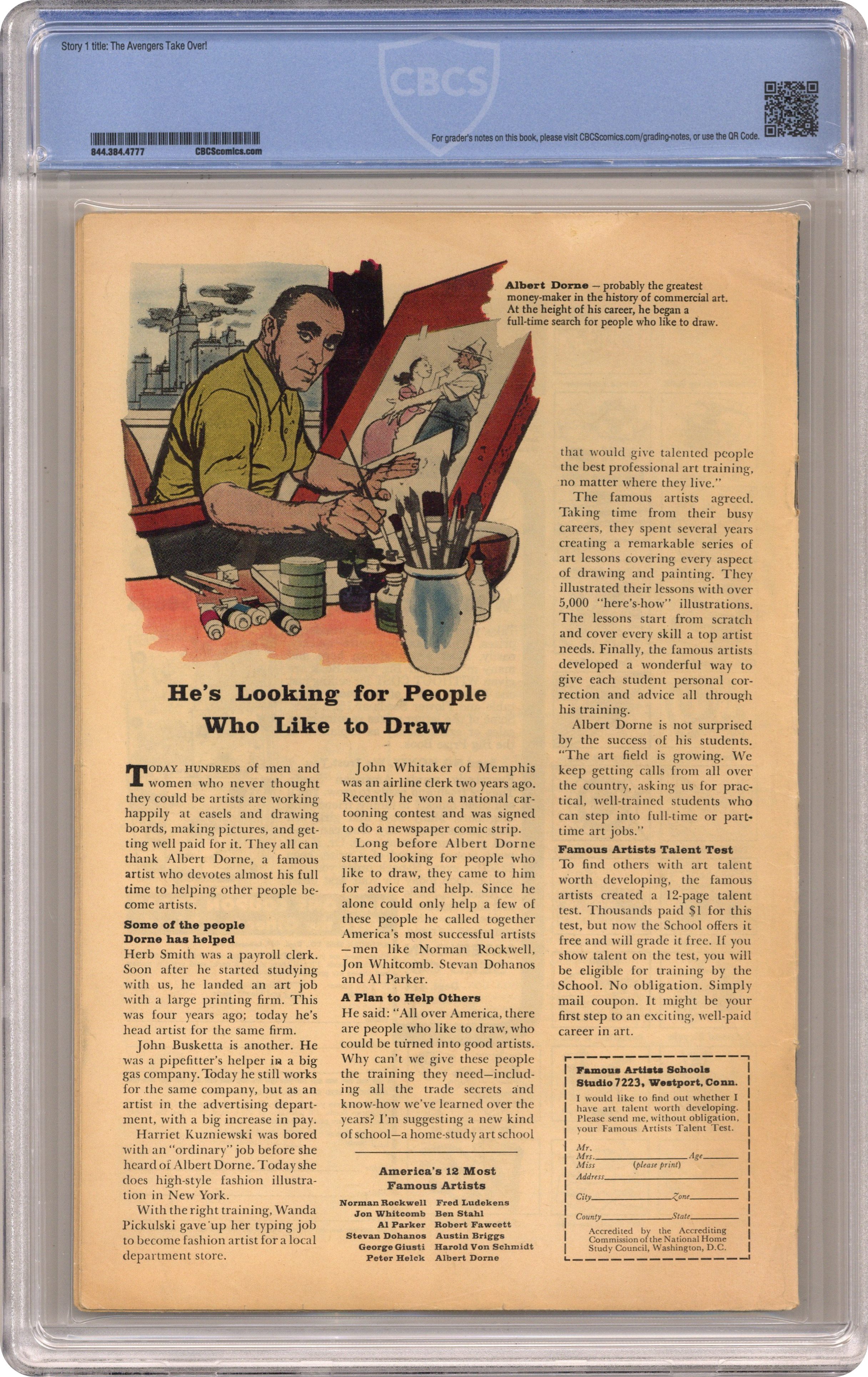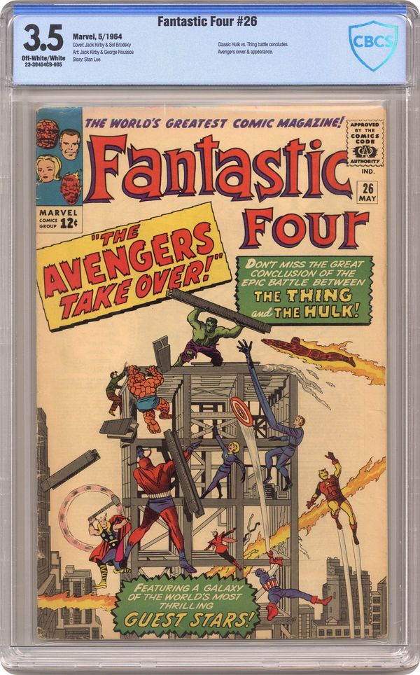 Cover pencils by Jack Kirby, inks by Sol Brodsky. The Avengers Take Over!, script by Stan Lee, pencils by Jack Kirby, inks by George Roussos [as George Bell]; The Avengers join the fight against Hulk. 36 pgs. $0.12. Cover price $0.12. Grade: CBCS 3.5 explanation of grade Condition: Used (collectible)