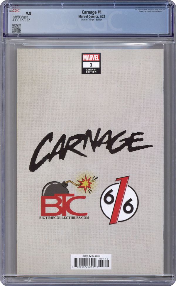 Ended Dec 11 2023 Winning Bid $50 Big Time Collectibles and The 616 Comics exclusive Virgin Cover by Mico Suayan. Written by Ram V. Art by Francesco Manna. THE BLOODCURDLING CARNAGE SERIES YOU'VE BEEN WAITING FOR! RAM V has carved a perfect home for himself in the symbiote corner of the Marvel U, and in this all-new ongoing series starring Venom's most notorious offspring, that corner is about to get a little bit bigger…and bloodier! After the revelations of CARNAGE FOREVER, and in a year that's set to be a celebration of all things CARNAGE, this is one symbiote story you cannot afford to miss! 36 pages, full color. Rated T+ Grade: CGC 9.8 explanation of grade Condition: Used (collectible)