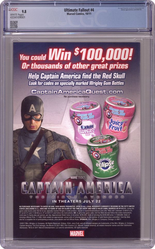 Ended Dec 27 2023 Winning Bid $1,206 Direct Edition. 1st appearance of Miles Morales. Written by BRIAN BENDIS, JONATHAN HICKMAN & NICK SPENCER. Art by SARA PICHELLI, SALVADOR LARROCA & CLAYTON CRAIN. Cover by MARK BAGLEY. What will become of Captain America? Where have all the X-Men gone? And what is up with the new Spider-Man suit? Don't miss the final chapters of one of the most talked about Ultimate events ever. 36 PGS. (each)/Rated T+...$3.99 (each) Cover price $3.99. Grade: CGC 9.8 explanation of grade Condition: Used (collectible)