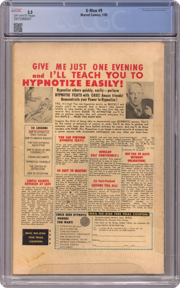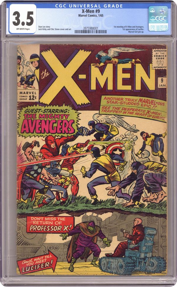 "Enter, The Avengers!" Script by Stan Lee, pencils and cover by Jack Kirby with inks by Chic Stone. 1st meeting of X-Men and the Avengers, 1st appearance of Lucifer. Also features a Marvel Girl "Marvel Masterwork" pin-up with pencils by Kirby and inks by Chic Stone. 36 pgs. Cover price $0.12. Grade: CGC 3.5 explanation of grade Condition: Used (collectible)