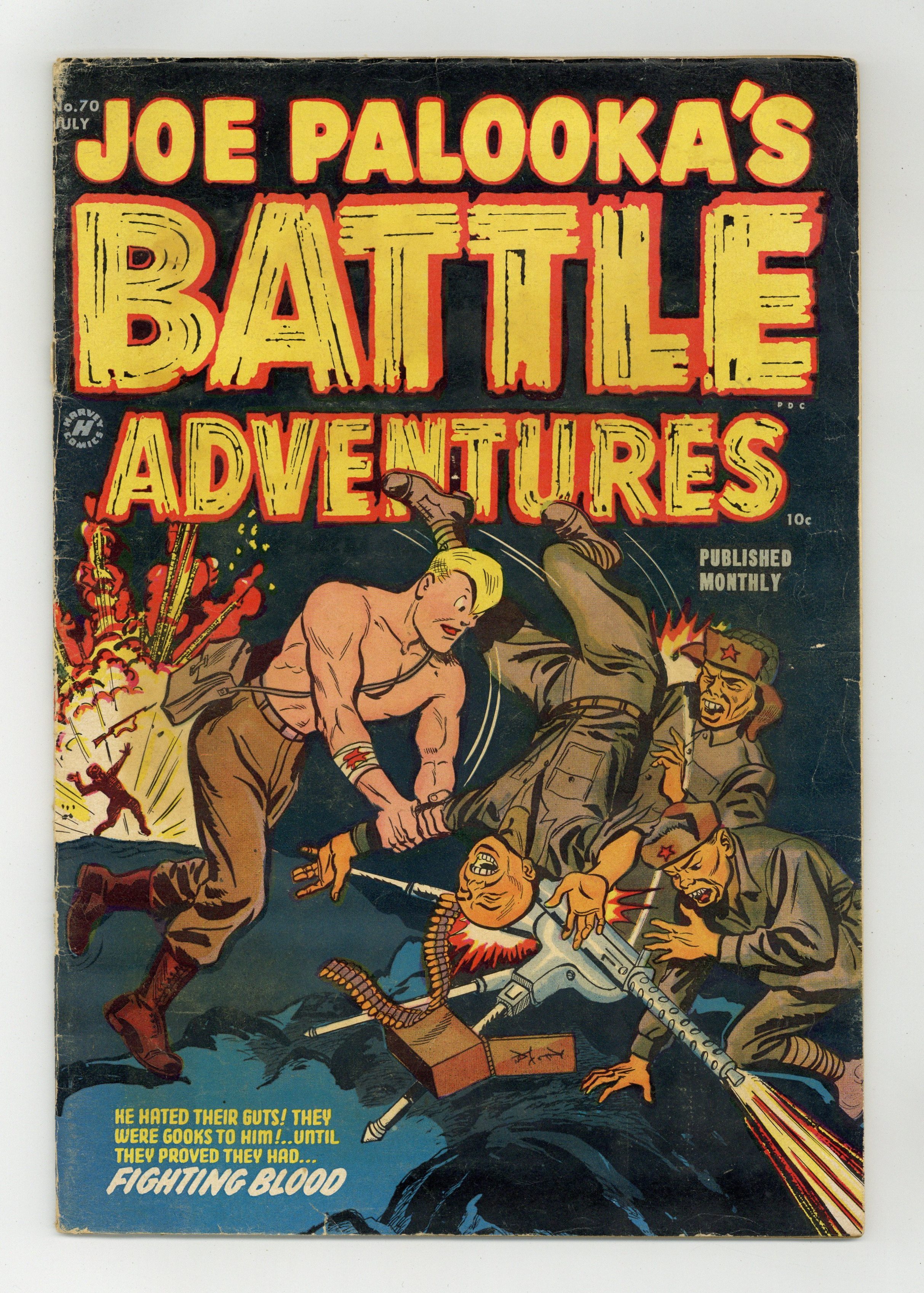 Cover by Al Avison (credited as Ham Fisher). Stories and art by Ham Fisher and Bob Powell. The amiable boxer strip becomes a pre-Code war comic as the Cold War and Korean conflict heat up. A sailor regrets firing the first shot of World War II. A hotshot soldier learns the hard way that he needs his unit to back him up when the fighting gets tough. Plus a year-by-year history of World War II, and a Joe Palooka story with a possible art assist from Fisher's assistant, future Li'l Abner cartoonist Al Capp. Fighting Blood; I Started World War II; Up And At 'Em!; The Story of World War II! 1939; The Final Blow; The Push. 32 pages, Full Color. Cover price $0.10. Grade: GD+ 2.5 explanation of grade Condition: Used (collectible)