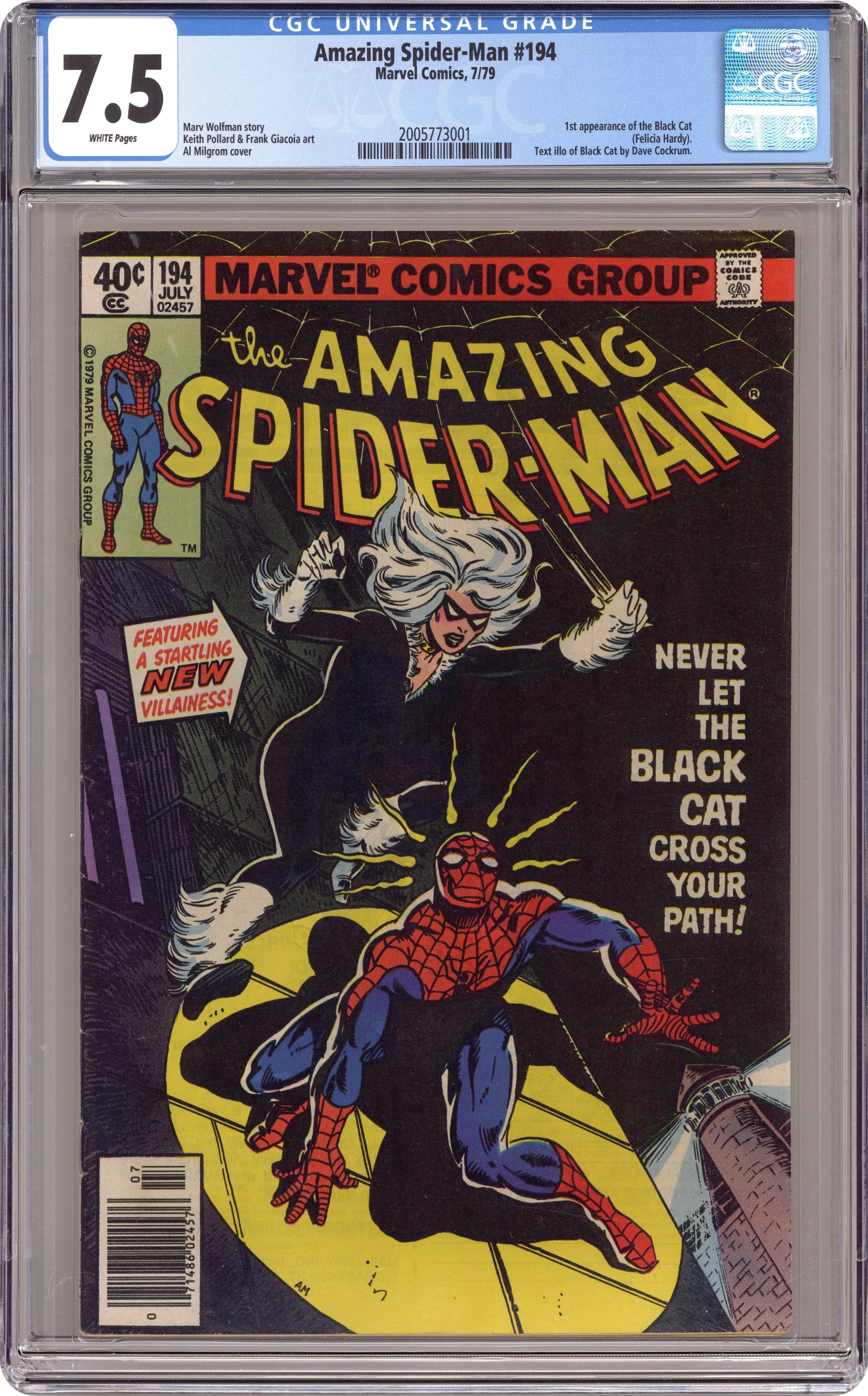 Ended Jan 19 2024 Winning Bid $235 Newsstand Edition. First appearance of the Black Cat in "Never Let The Black Cat Cross Your Path!" Part 1 of 2. Script by Marv Wolfman. Art by Keith Pollard (breakdowns) and Frank Giacoia (finishes). Cover by Al Milgrom. One of the landmark issues of the Amazing Spider-Man series! The dazzling debut of the Black Cat! The wall-crawler has spent the first 193 issues of his title chasing super-villains! But tonight he's going to kiss one instead! Wow! Does the web-slinger stand a chance against the beauty and charm of Felicia Hardy? Not when the alluring cat has his tongue! And maybe later his heart! A terrific issue! Cameo appearances by Aunt May, Betty Brant, Ned Leeds, Harry Osborn, Flash Thompson, Mysterio (in civilian clothes), and the burglar. (Notes: The Black Cat is the creative highlight of the Wolfman-Pollard run on the Amazing Spider-Man title. Dave Cockrum designed the cat's costume. The letters page includes an alternate cover (for issue 194) by Keith Pollard. It also includes an alternate cover to Spider-Woman 9 by Carmine Infantino. This two-part story was reprinted in the trade paperback: Spider-Man vs. the Black Cat (2005). 36 pages, full color. Cover price $0.40. Grade: CGC 7.5 explanation of grade Condition: Used (collectible)