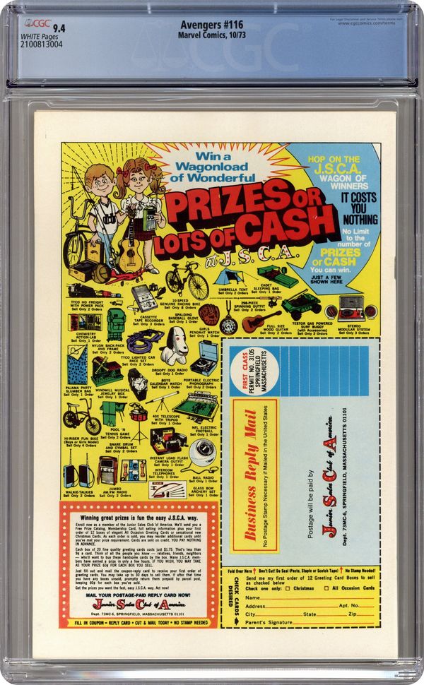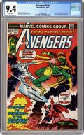 "Betrayal!" Avengers-Defenders crossover. Part 3 of 8. Guest-starring the Defenders. Script by Steve Englehart. Pencils by Bob Brown. Inks by Mike Esposito. Cover by John Romita and Mike Esposito. Story continues from Defenders 8. Earth's Mightiest Heroes visit Dr. Strange's townhouse in Greenwich Village and request permission to enter, but Wong slams the door in their faces! After an angry Thor breaks down the door, the Avengers storm inside, but a mystic spell sweeps them back out onto the street! Meanwhile gathered around the Orb of Agamotto, the Defenders put together a plan to find the six pieces of the Evil Eye. However, in the dark realm, Loki has grown suspicious of his dreadful ally! And contacts the Avengers to tell them about the Defenders' search for the ancient instrument from Avalon! So the die is cast! And the blockbuster battles are about to begin! Flashback cameos by Prester John, Wyatt Wingfoot, and the Human Torch to recap the history of the Evil Eye. Next Chapter: "The Silver Surfer vs. the Vision and the Scarlet Witch" The Avengers-Defenders Clash kicks into high gear as members of both teams span the globe to searching for the Evil Eye! And the first showdown features two of the most popular Marvel super-heroes of the 1970's! The Silver Surfer arrives in French Polynesia and plunges into the island's indigenous volcano to look for the Evil Eye. But the cosmic sky-rider's probing triggers a volcanic eruption! The fiery blast knocks a passing quinjet out of the sky and nearly kills the Scarlet Witch! Needless to say, this act enrages the synthezoid avenger! And in the heart of the raging volcano, the Vision and the Silver Surfer fight for the Evil Eye! Story continues in Defenders 9. (Notes: The Evil Eye previously appeared in Fantastic Four 54. This issue includes a full-page survey for readers to complete and mail back to the Marvel bullpen. A reprint edition exists for this issue.) 36 pgs. Cover price $0.20. Grade: CGC 9.4 explanation of grade Condition: Used (collectible)