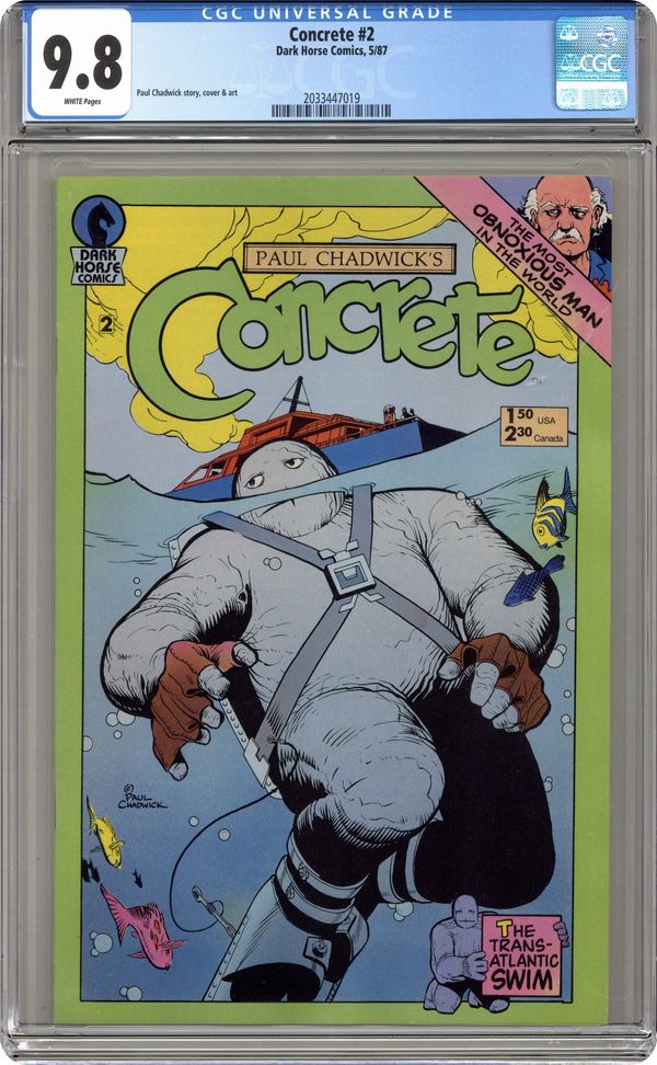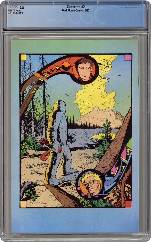 Story and art by Paul Chadwick. Only Concrete could conceive of it! Only Concrete could hope to succeed! Only Concrete could have such bad luck! See why Amazing Heroes call Paul Chadwick's Concrete "...a great comic...one of the pick hits of 1987." 32 pages, B&W. Cover price $1.50. Grade: CGC 9.8 explanation of grade Condition: Used (collectible)