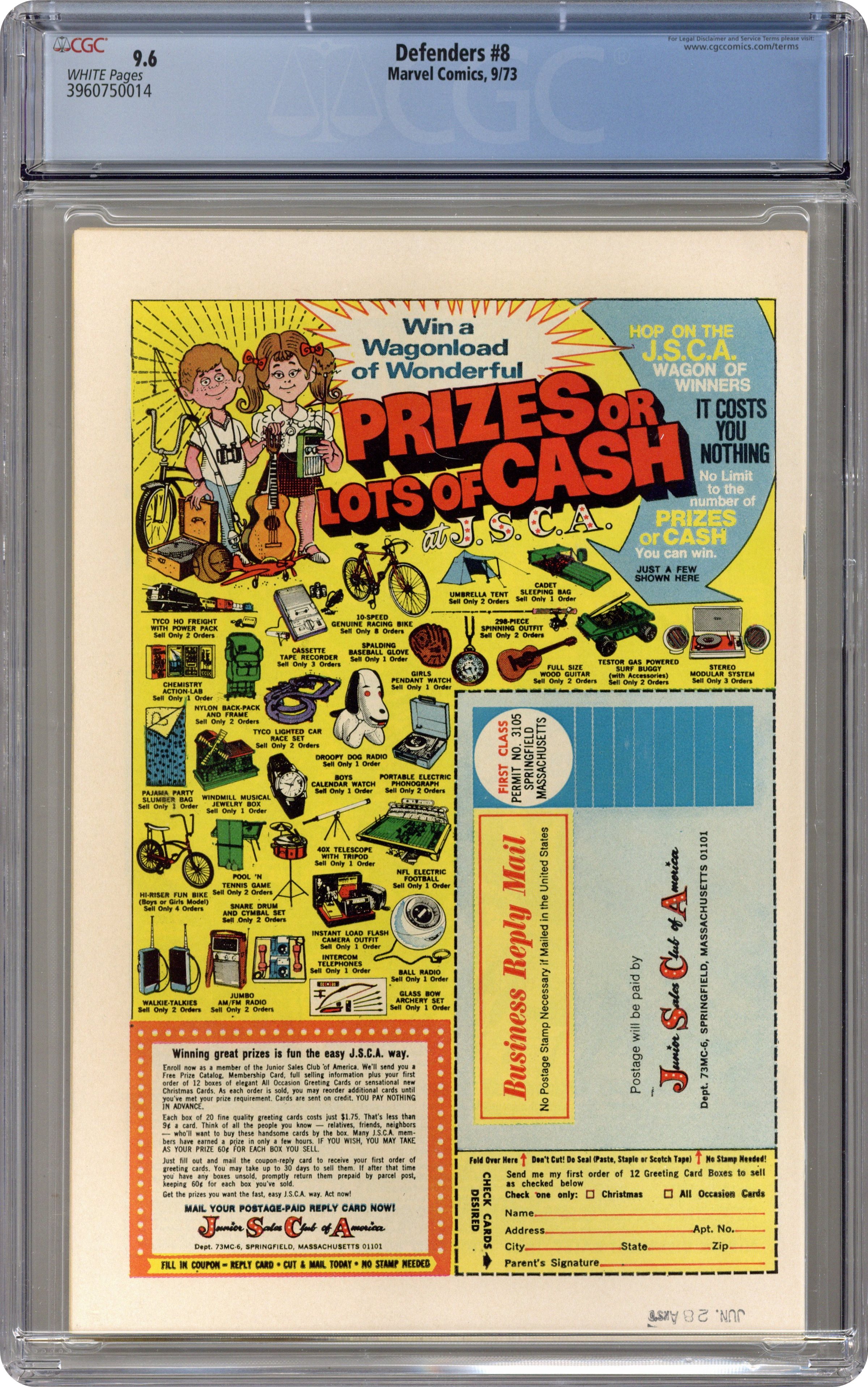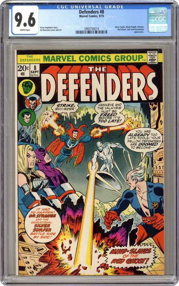 "If Atlantis Should Fall!" Part 2 of 2. Avengers-Defenders crossover. Script by Steve Englehart. Pencils by Sal Buscema. Inks by Frank McLaughlin. Cover by Sal Buscema. With Hawkeye, Valkyrie, and the Sub-Mariner as their mind-slaves, the Red Ghost and Attuma begin their quest to conquer Atlantis! The two super-villains' assault on the underwater citadel is progressing as planned until Doctor Strange and the Silver Surfer get wind of the attack! The key to victory is knocking out the Red Ghost! But how can the Master of the Mystic Arts and the cosmic sky-rider do that? Simple, just block all the cosmic rays from outer space from entering the Earth's atmosphere! Wow, it's a good thing these two defenders are among the most powerful heroes on the planet! Cameo appearances by Clea and Wong. Flashback cameo by the Unicorn. Second story: "Deception!" Avengers-Defenders Clash Part 2 of 8. Story continues from Avengers 115. Dr. Strange has a new plan for turning the Black Knight (from a stone statue) back into his normal self. The Master of the Mystic Arts magically contacts Dane Whitman's soul floating in the dark realm. The stranded Black Knight responds to Dr. Strange's message, but the knight's reply is intercepted and transposed by the Dread Dormammu and his new ally, Loki! What is the fateful message that eventually reaches the Defenders? "Go find the Evil Eye." Story continues in Avengers 116. Defenders Lineup: Doctor Strange, Hawkeye, Hulk, Silver Surfer, Sub-Mariner, and Valkyrie. (Note: The Red Ghost returns in Iron Man 82.) 36 pages Cover price $0.20. Grade: CGC 9.6 explanation of grade Condition: Used (collectible)