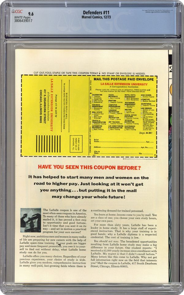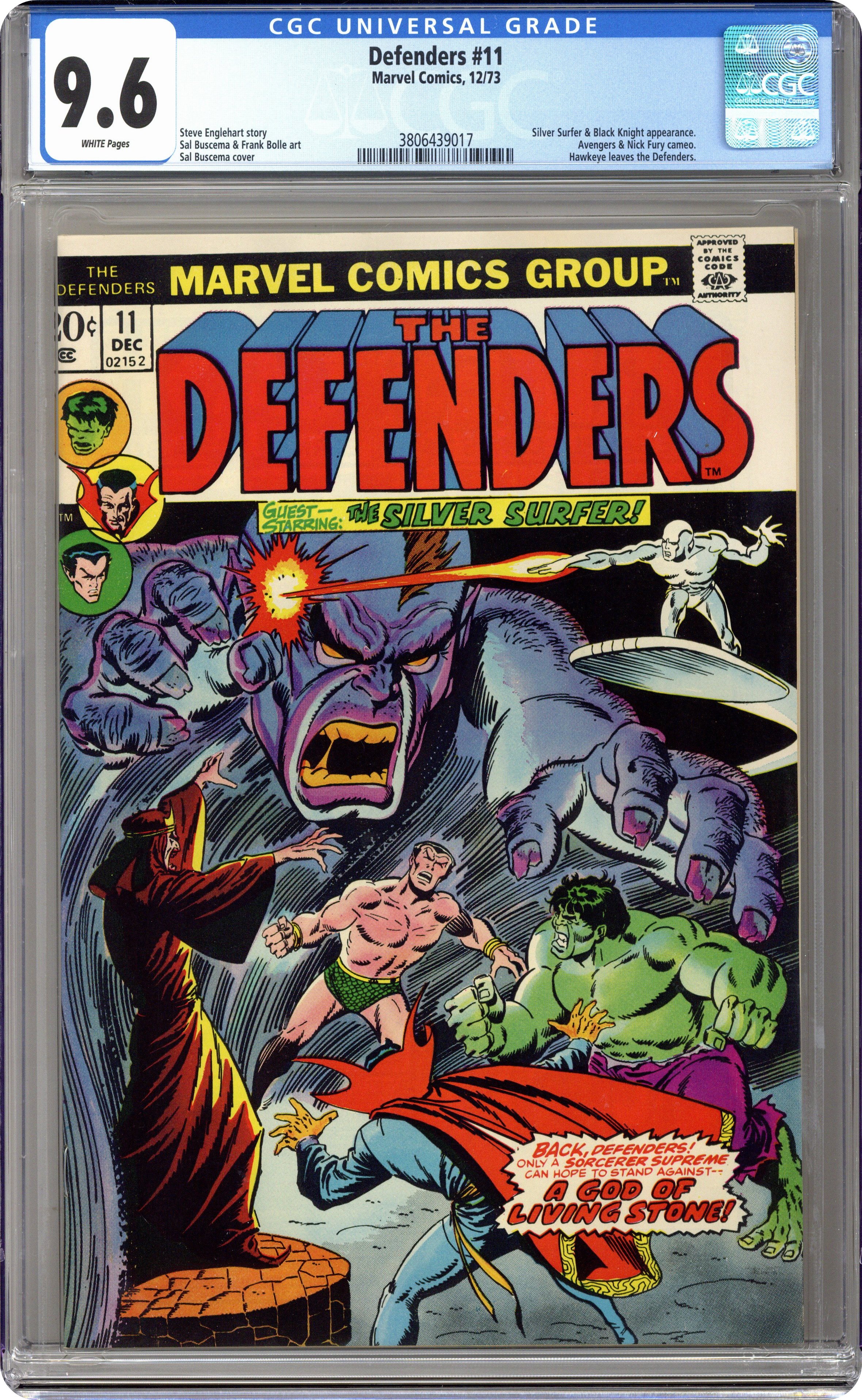 Ended Jul 19 2024 Winning Bid $144 The Avengers/Defenders crossover continues with "A Dark and Stormy Knight." Script by Steve Englehart, pencils by Sal Buscema. Inks by Frank Bolle. Cover by John Romita. Story continues from Avengers 118. The epic battle vs. Dormammu is over and Earth has survived! But there's one more mission remaining for the Defenders! Return the Black Knight's stone body back to flesh and blood. To that end six defenders along with the Evil Eye travel back in time to the 12th century and find Dane Whitman smack dab in the middle of the Crusades! The super-heroes from the 20th century get a medieval history lesson as all the famous combatants are present: Prince John, Mordred the Evil, Chandu, Prester John, and Richard the Lionheart! Can the Dynamic Defenders save the King (and the Black Knight)? Cameo appearances by the Avengers, Nick Fury, and Loki. Defenders Lineup: Doctor Strange, Hawkeye, Hulk, Silver Surfer, Sub-Mariner, and Valkyrie. (Notes: Prester John previously appeared in Fantastic Four (1st series) 54. The 20th century stone statue of the Black Knight comes to life in Avengers 157. The 12th century Black Knight (aka Dane Whitman) and the Evil Eye return in Avengers 225 & 226.) 36 pgs. Cover price $0.20. Grade: CGC 9.6 explanation of grade Condition: Used (collectible)