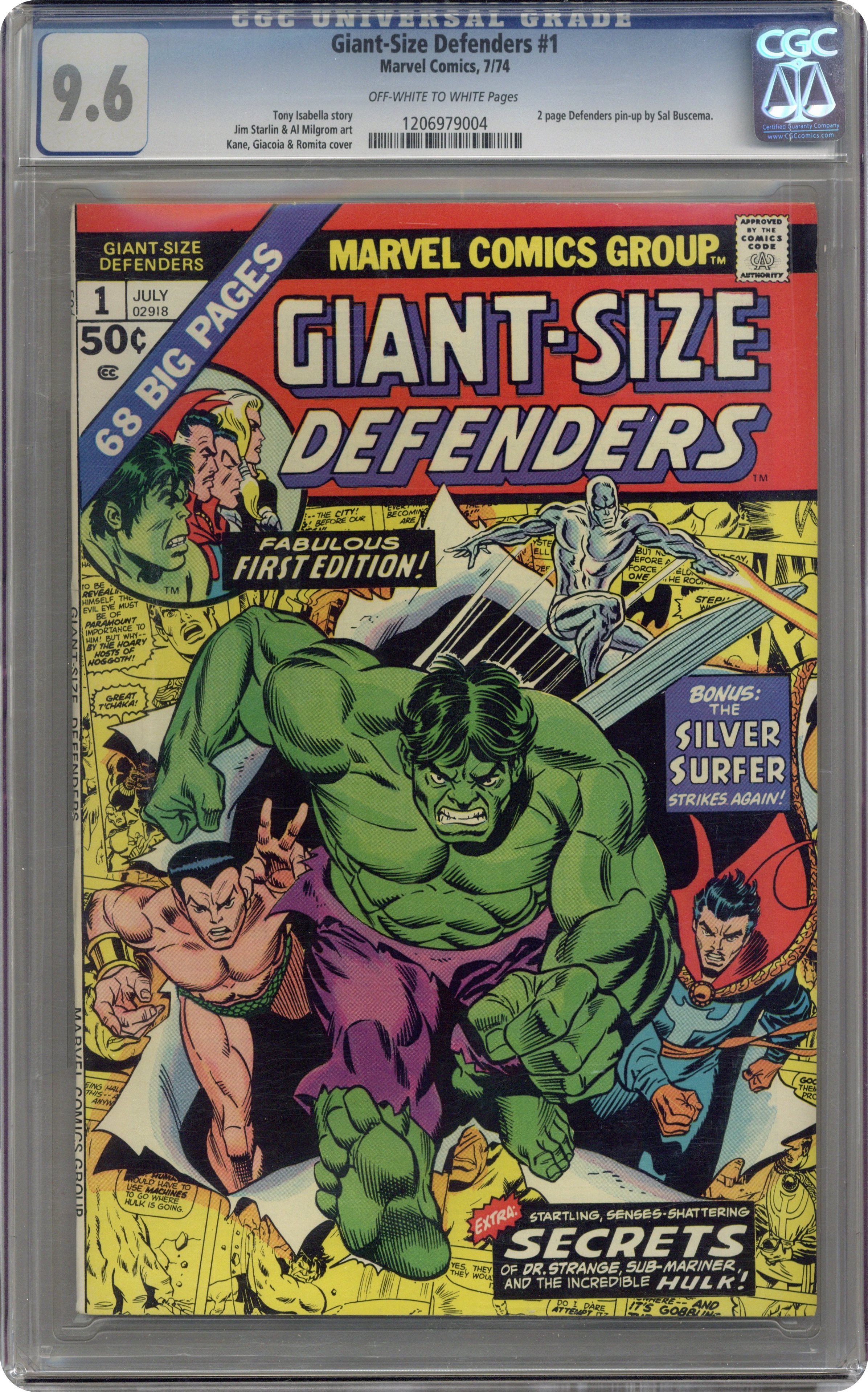 Ended Jul 21 2024 Winning Bid $156 Cover pencils by Gil Kane and John Romita (alterations), inks by Frank Giacoia and John Romita (alterations). New story: "The Way They Were!", script by Tony Isabella, pencils by Jim Starlin, inks by Al Milgrom; Valkyrie learns the origins of the Hulk, Namor and Dr. Strange and the Defenders stop Rasputin. Reprints: "Banished to Outer Space", script by Stan Lee, pencils by Jack Kirby, inks by Dick Ayers; The military captures Rick and Ross convinces him that they need the Hulk to test a new experimental rocket for national security; Rick tricks the jade giant into the capsule but once it is shot into space, he realizes that Ross deceived him to get rid of his foe. Bird of Prey! starring Sub-Mariner and Princess Fen, script and art by Bill Everett. "To Catch a Magician!" starring Doctor Strange and Mr. Rasputin, script by Steve Ditko (plot) and Denny O'Neil (dialogue), art by Steve Ditko. "The Peerless Power of the Silver Surfer," script by Stan Lee, pencils by Jack Kirby; inks by Frank Giacoia; featuring Quasimodo. The Dynamic Defenders! illustration by Sal Buscema. 68 pgs., full color. $0.50. Cover price $0.50. Grade: CGC 9.6 explanation of grade Condition: Used (collectible)