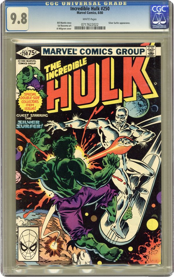 Ended Apr 26 2024 Winning Bid $242 Direct Edition. Special giant-sized issue. Guest-starring Silver Surfer. A 250th celebration brought to you by Bill Mantlo and Sal Buscema. The Earth trembles when titans clash. It's the nigh unstoppable Incredible Hulk vs. the former Herald of Galactus, the Silver Surfer. Imprisoned on Earth by his former master, the Silver Surfer intends to add the immeasurable power of the Hulk to his own and break the barrier that keeps him from his home Zenn-La and his beloved. The only problem is, the Hulk has never been known for his generosity. 52 pages. Cover price $0.75. Grade: CGC 9.8 explanation of grade Condition: Used (collectible)