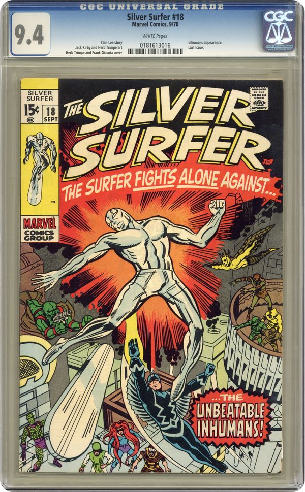 "To Smash the Inhumans!" Final issue of the series. Guest-starring the Inhumans. Script by Stan Lee. Pencils by Jack Kirby. Inks by Herb Trimpe. Cover by Herb Trimpe (with possible layouts or pencils by Marie Severin.) The Silver Surfer renounces his peaceful ways and decides to fight against mankind instead of with them! And despite their best efforts, the Inhumans cannot convince the cosmic sky-rider otherwise! Unfortunately, the story ends on a cliffhanger as the series was canceled. Appearances by Black Bolt, Medusa, Gorgon, Karnak, Triton, and Maximus. (Note: The surfer's next chronological appearance comes in Webspinners Tales of Spider-Man (1999) #4 where the dangling plotline (from 29 years earlier) is at last addressed.) 32 pages. Cover price $0.15. Grade: CGC 9.4 explanation of grade Condition: Used (collectible)