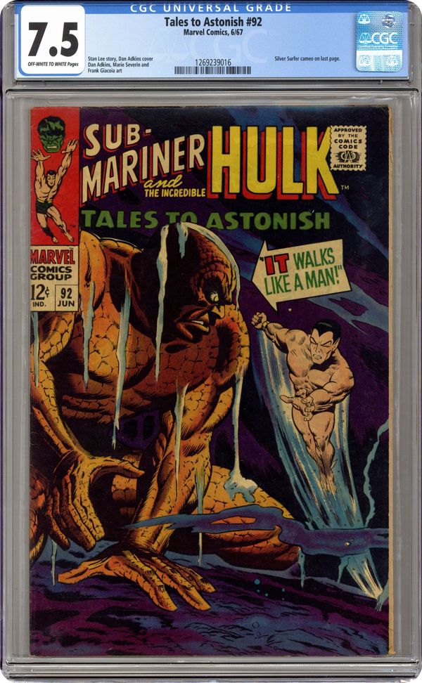 Ended Feb 12 2024 Winning Bid $84 Cover by Don Heck and Dan Adkins. :It Walks Like a Man!, script by Stan Lee, art by Dan Adkins; When a passing ship dumps a radioactive barrel into Namor's realm, he realizes the danger it poses and takes it far away from Atlantis to throw it into a deep crevasse; Little does he know that the radiation in the barrel has awakened an ancient monster who begins to menace both the surface world and the world beneath the waves alike. Turning Point!, script by Stan Lee, art by Marie Severin and Frank Giacoia; Betty bemoans her loss of Bruce; Bruce, in disguise, bemoans his circumstances, then transforms into Hulk who flees his hotel room in typical Hulk fashion - through the wall; Outside, Hulk sees a 'flying saucer' and leaps to bring it down so the aliens can take him far from Earth; What he brings down is not a saucer but the mighty Silver Surfer! 36 pgs., full color. $0.12. Cover price $0.12. Grade: CGC 7.5 explanation of grade Condition: Used (collectible)