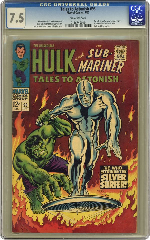 Ended May 8 2024 Winning Bid $328 Cover by Marie Severin and Frank Giacoia. The Monarch and the Monster, script by Roy Thomas and Dan Adkins; As Namor battles It, torpedoes from the submarine cause an avalanche, trapping It; Namor turns on the submarine and begins to punch holes in it; It (the creature) returns and they battle, further damaging the submarine and (apparently) killing it;The submarine leaves (with the carcass of It) while Namor breaks off, feeling weakness overwhelm him. He Who Strikes the Silver Surfer, script by Stan Lee, art by Marie Severin; Having 'caught' the Silver Surfer (believing him to be an alien starship), Hulk starts a fight with perhaps the only being on Earth stronger than Hulk is; The Surfer, irritated, knocks him out, then probes Hulk to discover the reason for his belligerence and discovers the damage done by the gamma radiation; Just as the Surfer prepares to reverse the damage and return Dr. Banner's life, Hulk wakes up and, seeing the action as an attack, lashes out. 36 pages, full color. Cover price $0.12. Grade: CGC 7.5 explanation of grade Condition: Used (collectible)